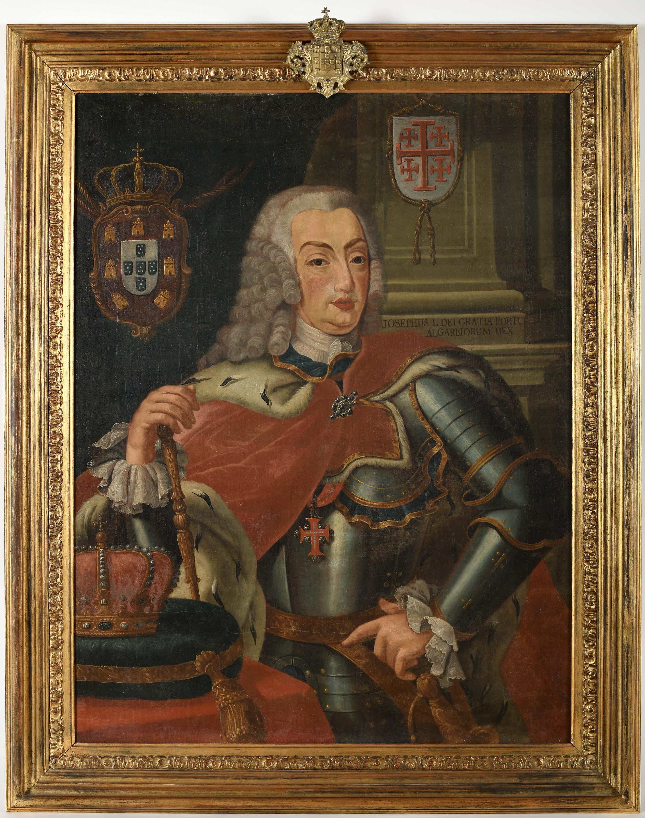 Retrato do Rei D. José I (1714-1777) óleo sobre tela fundo com armas do Rei de Portugal e armas da Ordem Equestre do Santo Sepulcro de Jerusalém escola Portuguesa séc. XVIII (3º quartel) reentelado, restauros, moldura não original em madeira dourada com aplicação em bronze "Armas do Reino de Portugal" Dimensões (altura x comprimento x largura) - 104,5 x 80,5 cm