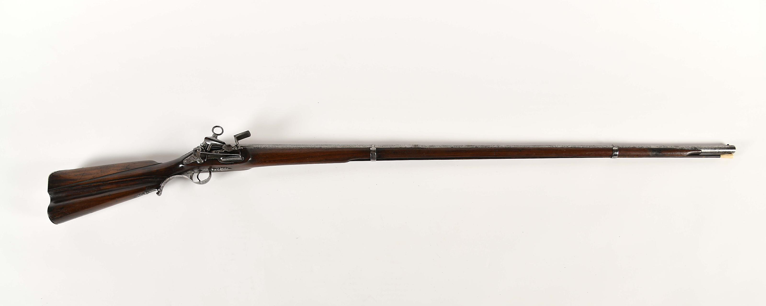 Espingarda de caça - sistema de pederneira nogueira e aço cano com decoração damasquinada a ouro "Flores-de-lis encimadas por cruz" Portuguesa séc. XVIII (cerca de 1728 a 1758) aço com vestígios de oxidação mecanismo e cano marcados X DOR/EYS [Xavier dos Reis] encimado por coroa Dimensões (altura x comprimento x largura) - 160 cm