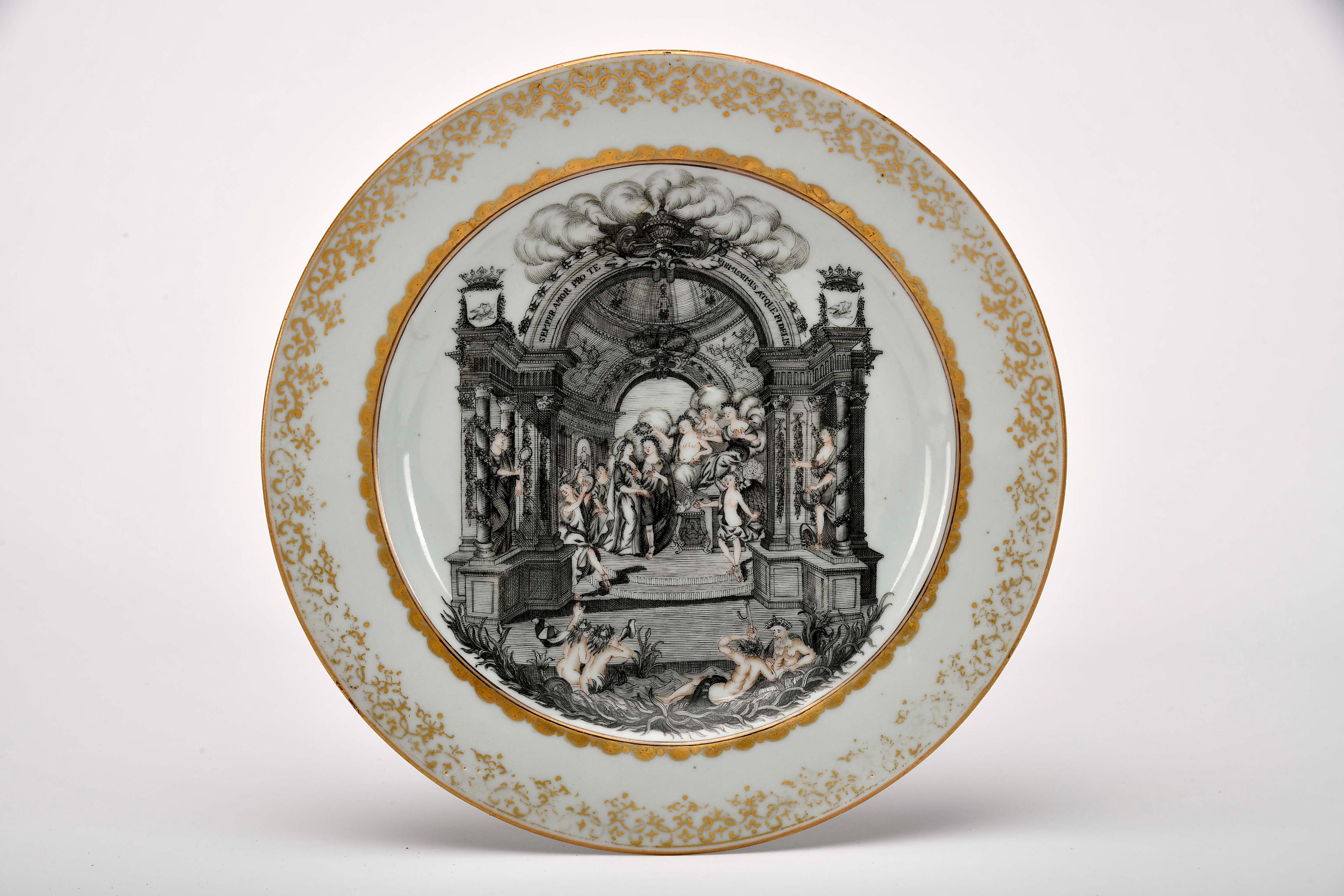 Prato porcelana Chinesa de exportação decoração a grisaille, sépia e dourado "Casamento abençoado por Juno" reinado Qianlong (1736-1795) ligeiro desgaste no dourado Dimensões (altura x comprimento x largura) - 22,7 cm Notas: vd. HERVOUËT, François et Nicole; BRUNEAU, Yves - "La Porcelaine des Compagnies des Indes à Décor Occidental". Paris: Flammarion, 1986, p. 316, fig. 13.87.