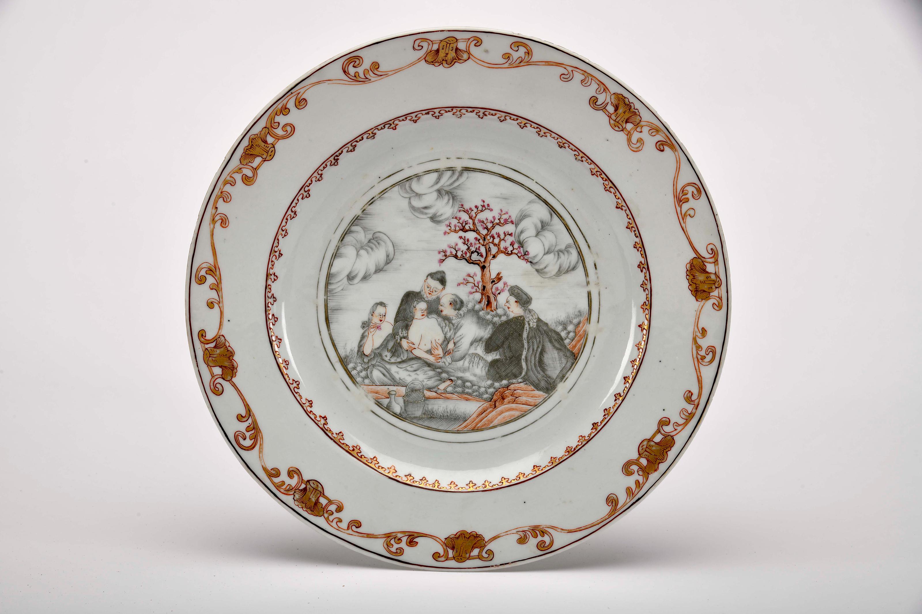 Prato porcelana Chinesa de exportação decoração a grisaille, sépia, rosa e dourado "Paisagem com cena erótica", aba com "Motivos vegetalistas" reinado Qianlong (1736-1795) esbeiçadelas, ligeiro desgaste na decoração Dimensões (altura x comprimento x largura) - 23,5 cm