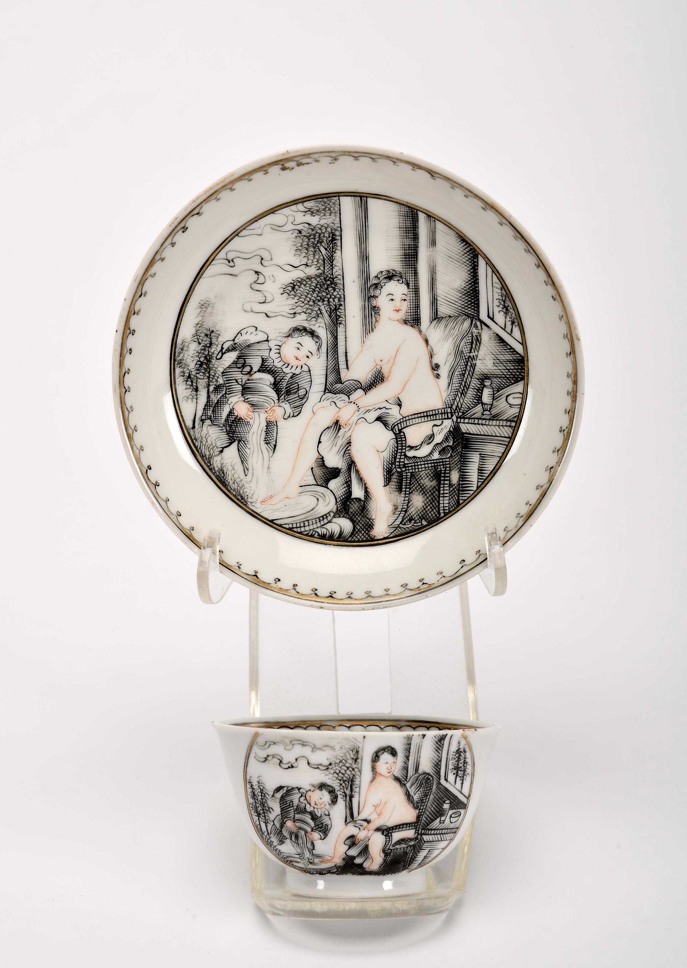 Taça com pires porcelana Chinesa de exportação decoração a grisaille, sépia e dourado "Toilette de senhora" reinado Qianlong (1736-1795) ínfimas esbeiçadelas, ligeiro desgaste no dourado Dimensões (altura x comprimento x largura) - (taça) 4,2 x 7,1 cm; (pires) 12 cm Notas: vd. HERVOUËT, François et Nicole; BRUNEAU, Yves - "La Porcelaine des Compagnies des Indes a Décor Occidental", Flammarion. Paris: 1986, p. 125, fig. 6.30.