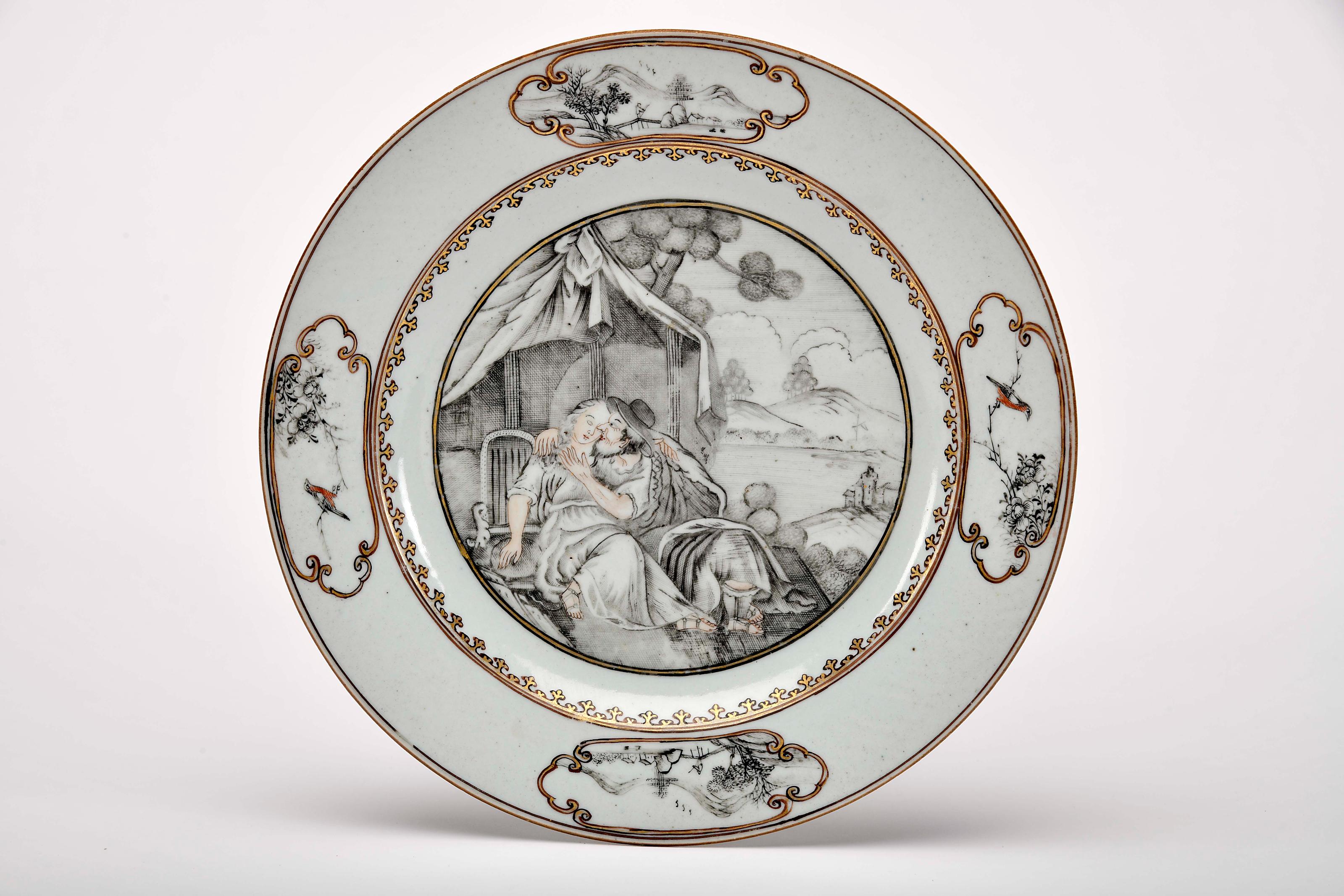 Prato porcelana Chinesa de exportação decoração a grisaille, sépia, rouge-de-fer, negro e dourado "Casal", aba com reservas "Paisagem e pássaros" reinado Qianlong (1736-1795) ínfimas esbeiçadelas, algum desgaste na decoração Dimensões (altura x comprimento x largura) - 22,5 cm Notas: vd. HERVOUËT, François et Nicole; BRUNEAU, Yves - "La Porcelaine des Compagnies des Indes a Décor Occidental", Flammarion, Paris, 1986, p. 165, nº 7.70; e VEIGA, Jorge Getúlio - "Chinese Export Porcelain in Private Brasilian Collections". London: Han-Shan Tang, 1989, p. 166, nº 138.