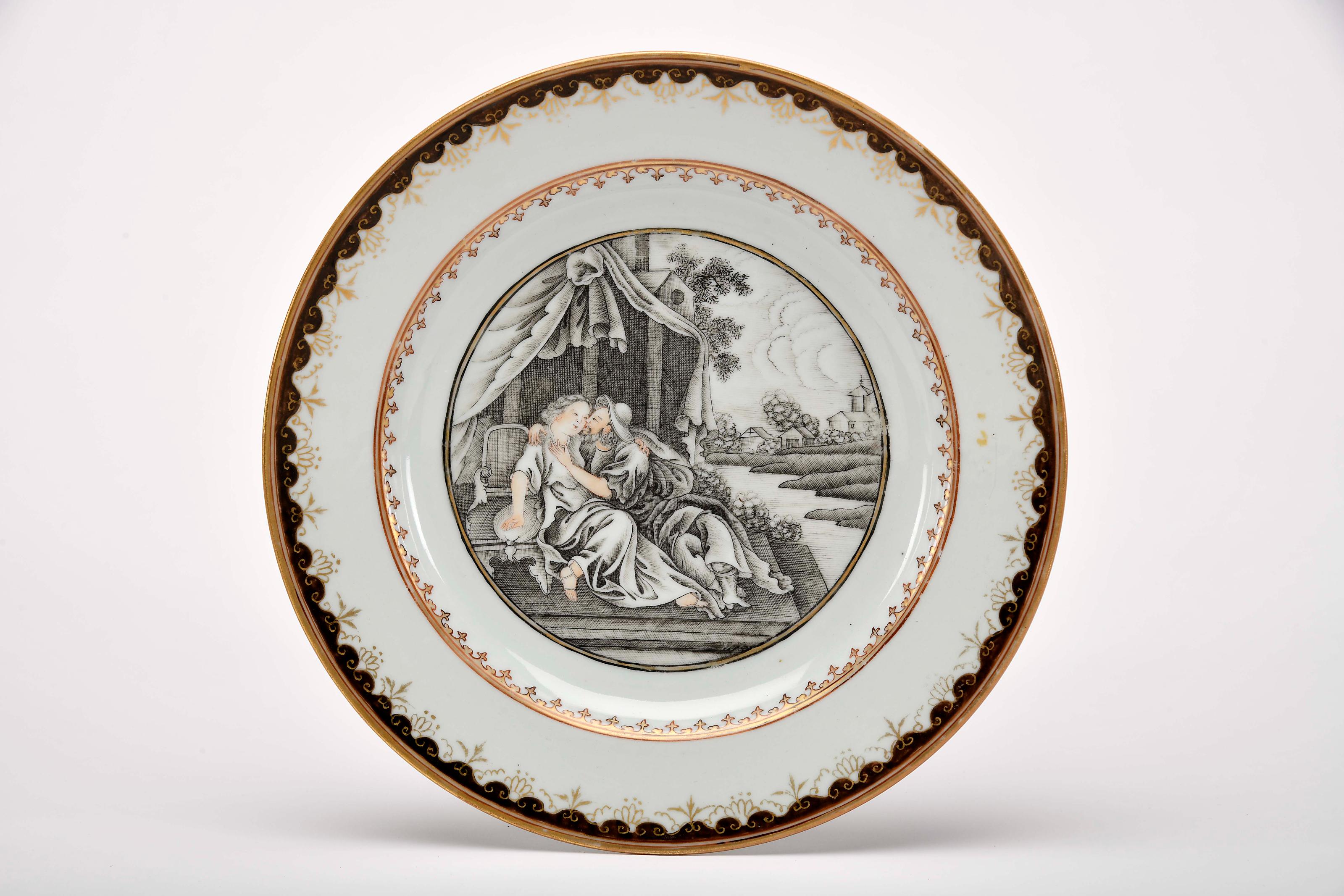 Prato porcelana Chinesa de exportação decoração a grisaille, sépia, rouge-de-fer, negro e dourado "Casal" reinado Qianlong (1736-1795) esbeiçadela, ligeiro desgaste no dourado Dimensões (altura x comprimento x largura) - 22,5 cm Notas: vd. HERVOUËT, François et Nicole; BRUNEAU, Yves - "La Porcelaine des Compagnies des Indes a Décor Occidental", Flammarion, Paris, 1986, p. 165, nº 7.70; e VEIGA, Jorge Getúlio - "Chinese Export Porcelain in Private Brasilian Collections". London: Han-Shan Tang, 1989, p. 166, nº 138.