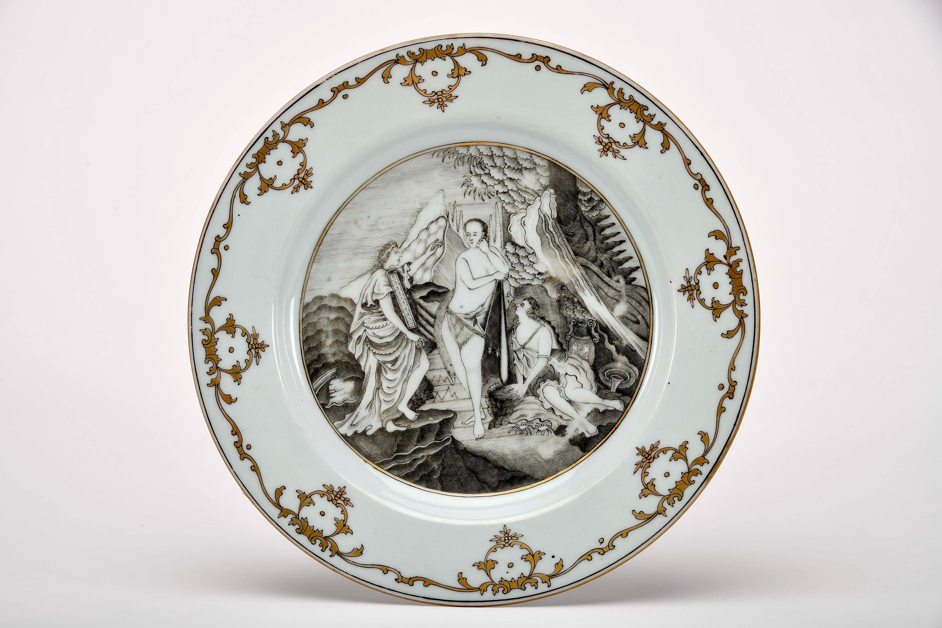 Prato porcelana Chinesa de exportação decoração a grisaille e dourado "Hércules rejeita o Prazer e escolhe a Virtude" segundo pintura original de Paolo de Matteis (1662-1728), aba com "Motivos vegetalistas" reinado Qianlong (1736-1795) pequenas esbeiçadelas, ligeiro desgaste na decoração Dimensões (altura x comprimento x largura) - 23 cm Notas: vd. HERVOUËT, François et Nicole; BRUNEAU, Yves - "La Porcelaine des Compagnies des Indes à Décor Occidental". Paris: Flammarion, 1986, p. 313, fig. 13.81.