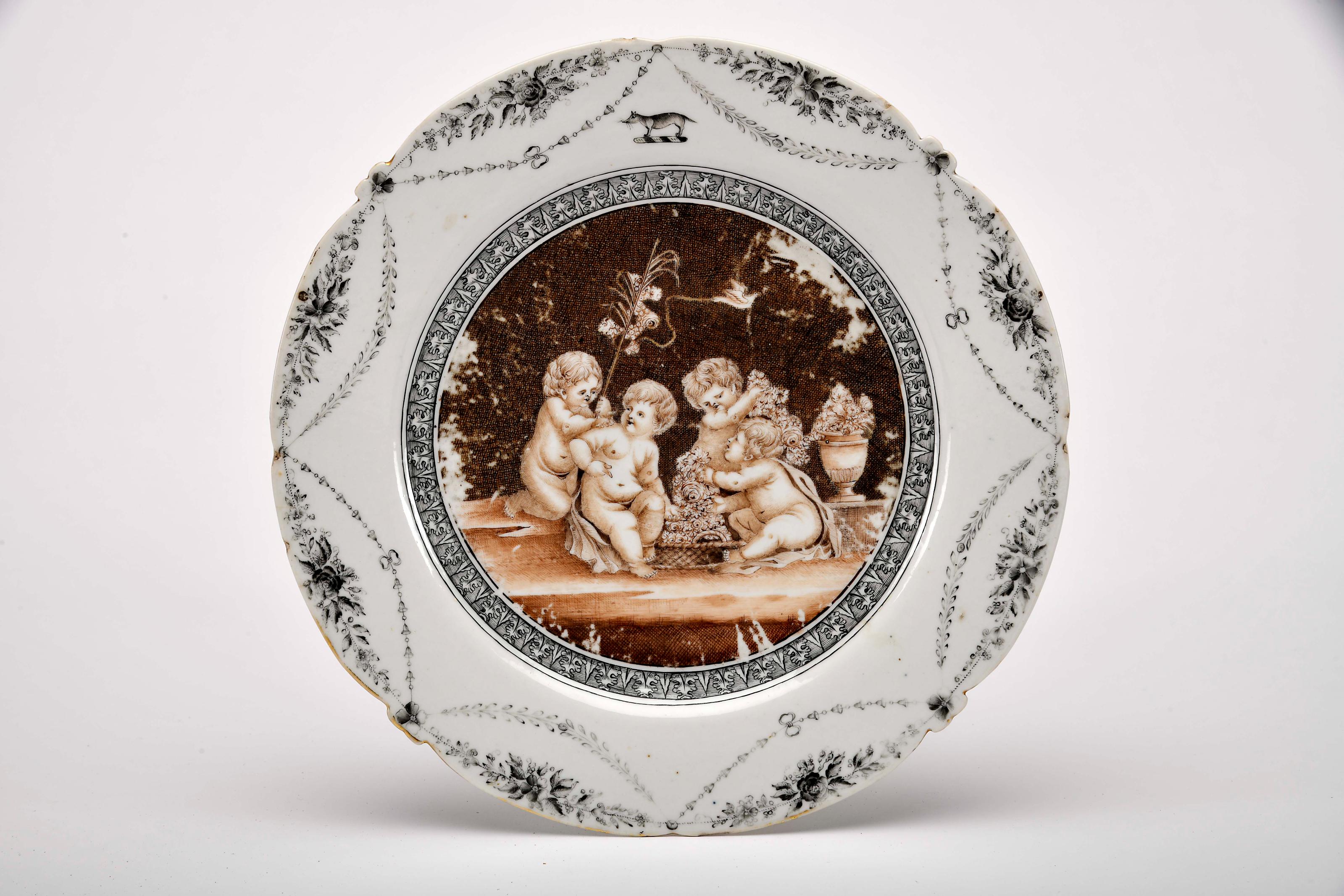 Prato recortado porcelana Chinesa de exportação decoração a sépia e grisaille "Alegoria ao Outono" segundo gravura de Francesco Bartolozzi (1727-1815) a partir de pintura original de Giovanni Cipriani (1727-1785), aba com "Grinaldas" reinado Qianlong (1736-1795) cabelo, esbeiçadelas, desgaste na decoração Dimensões (altura x comprimento x largura) - 25 cm Notas: vd. HERVOUET, François et Nicole; BRUNEAU, Yves - "La Porcelaine des Compagnies des Indes à Décor Occidental". Paris: Flammarion, 1986, p. 320, fig. 13.96; e HOWARD, David; AYERS, John - “China for the West - Chinese Porcelain and other decorative arts export illustrated from the Mottahedeh Collection”. London: Sotheby Park Barnet, 1978, vol. II, p. 376, nº 370.