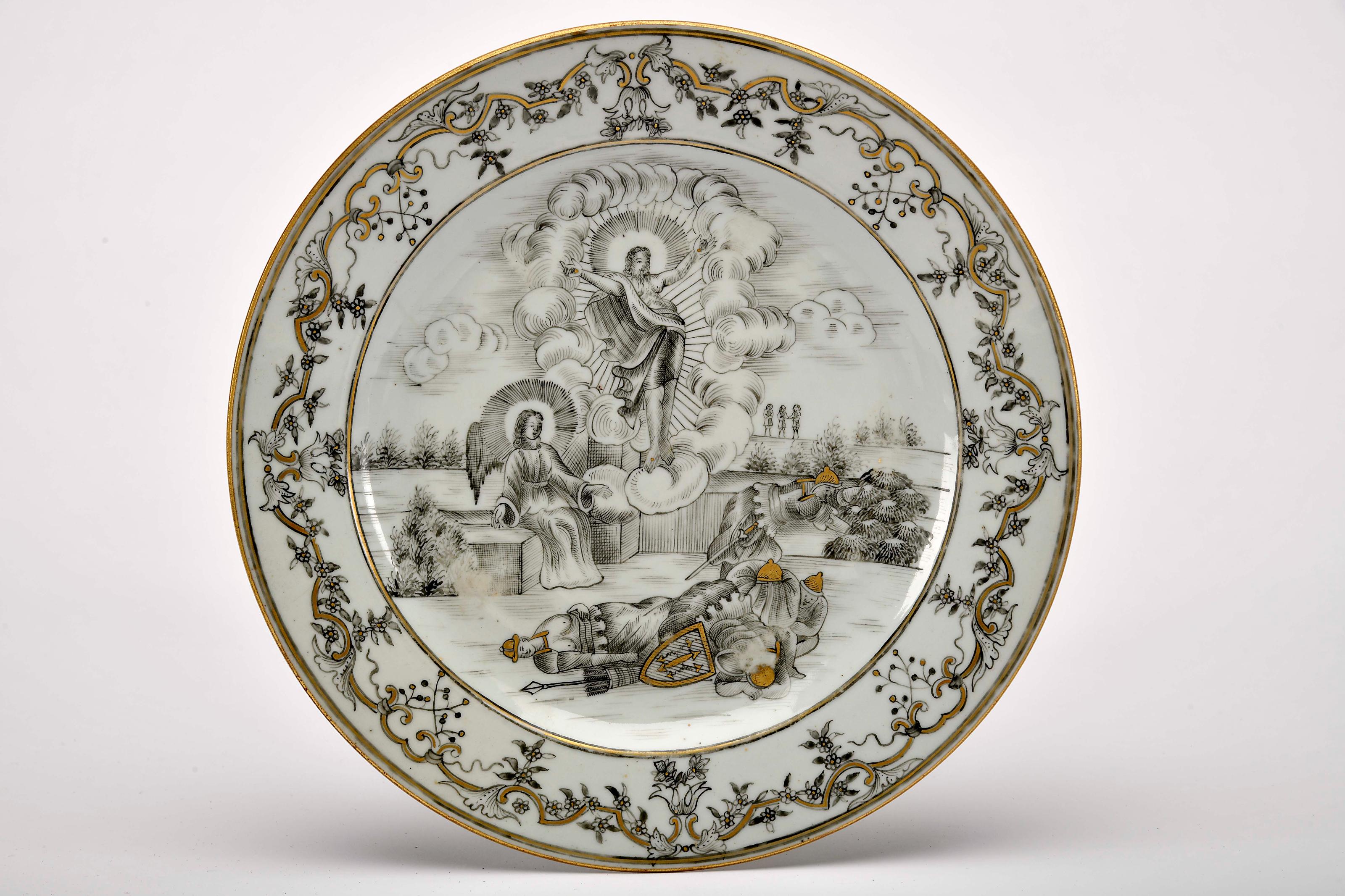 Prato porcelana Chinesa de exportação decoração a grisaille e dourado "Ressurreição", aba com "Motivos vegetalistas" reinado Qianlong (1736-1795) ligeiro desgaste na decoração Dimensões (altura x comprimento x largura) - 22,5 cm Notas: vd. HERVOUËT, François et Nicole; BRUNEAU, Yves - "La Porcelaine des Compagnies des Indes a Décor Occidental". Paris: Flammarion, 1986, p. 267, fig. 11.26.