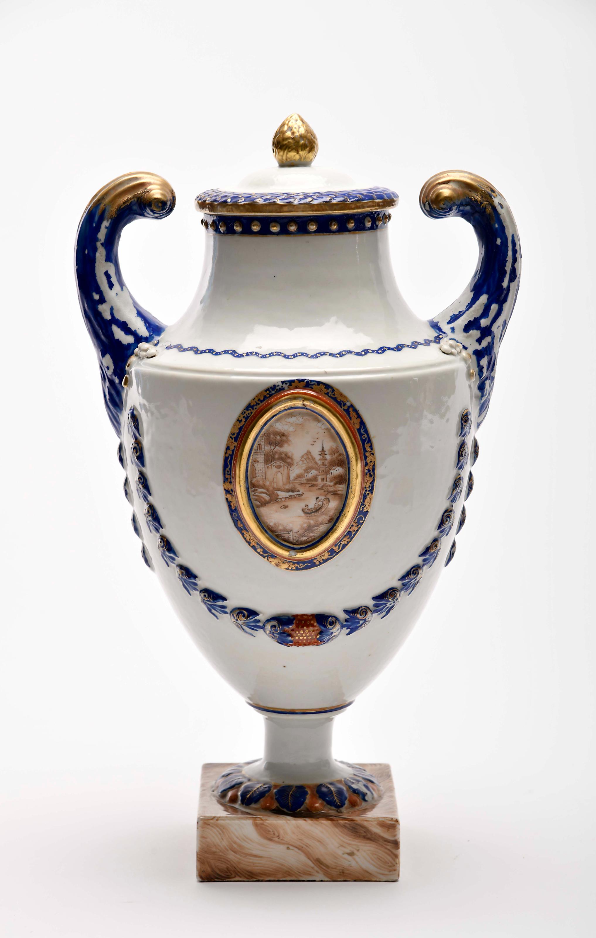 Urna com tampa porcelana Chinesa de exportação decoração relevada a azul, sépia e dourado "Grinaldas", reservas a sépia "Paisagem com figuras europeias" reinado Jiaqing (1796-1820) faltas na decoração Dimensões (altura x comprimento x largura) - 43 cm Notas: vd. exemplar semelhante em BEURDELEY, Michel - Porcelaine de la Compagnie des Indes. Fribourg: Office du Livre, 1962, p. 71 - Pl. XIV.
