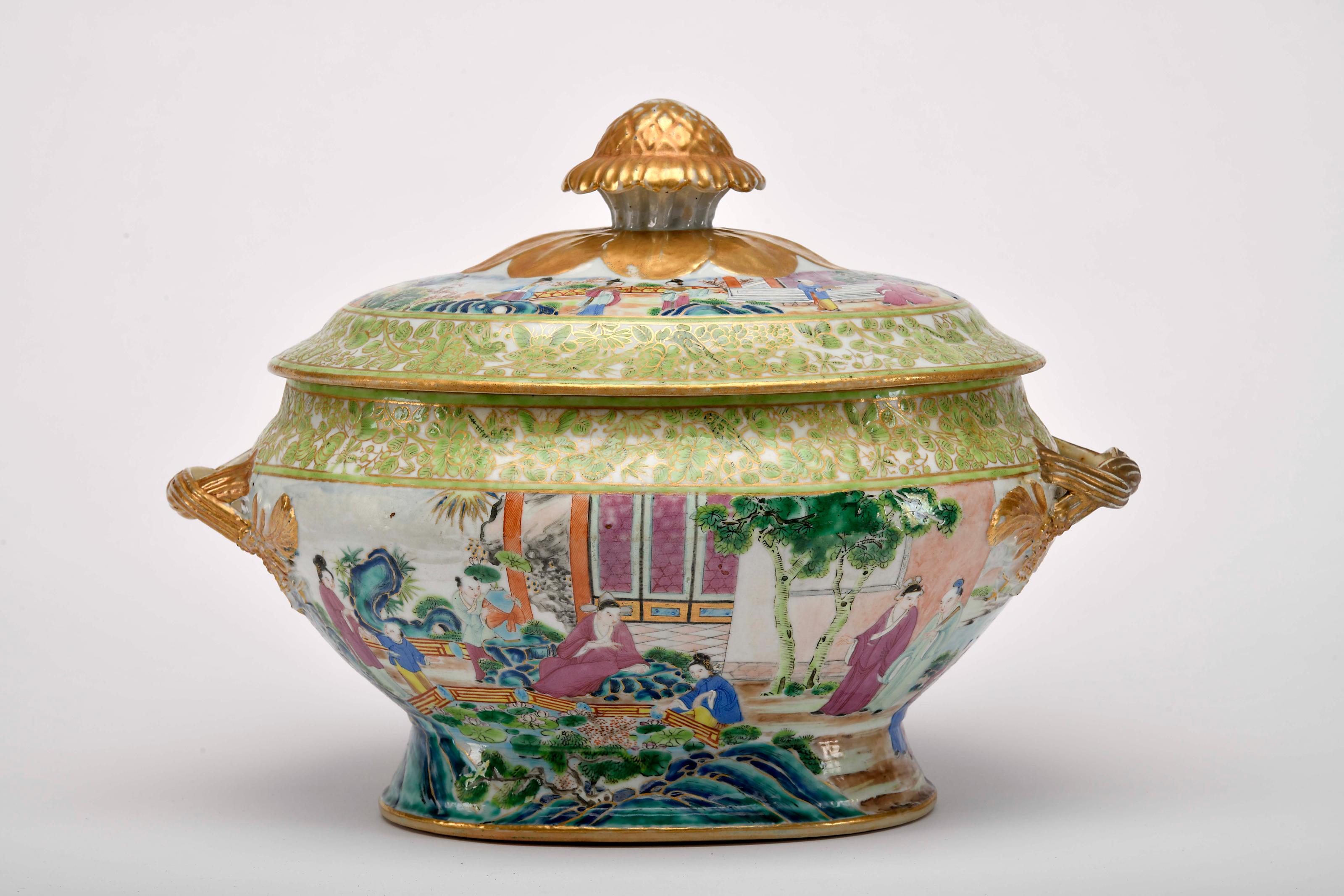 Terrina porcelana Chinesa de exportação decoração policromada e dourada "Paisagem com figuras chinesas", pomo e pegas relevadas reinado Daoguang (1821-1850) uma pega com restauro, desgaste no dourado Dimensões (altura x comprimento x largura) - 27 x 35 x 24 cm