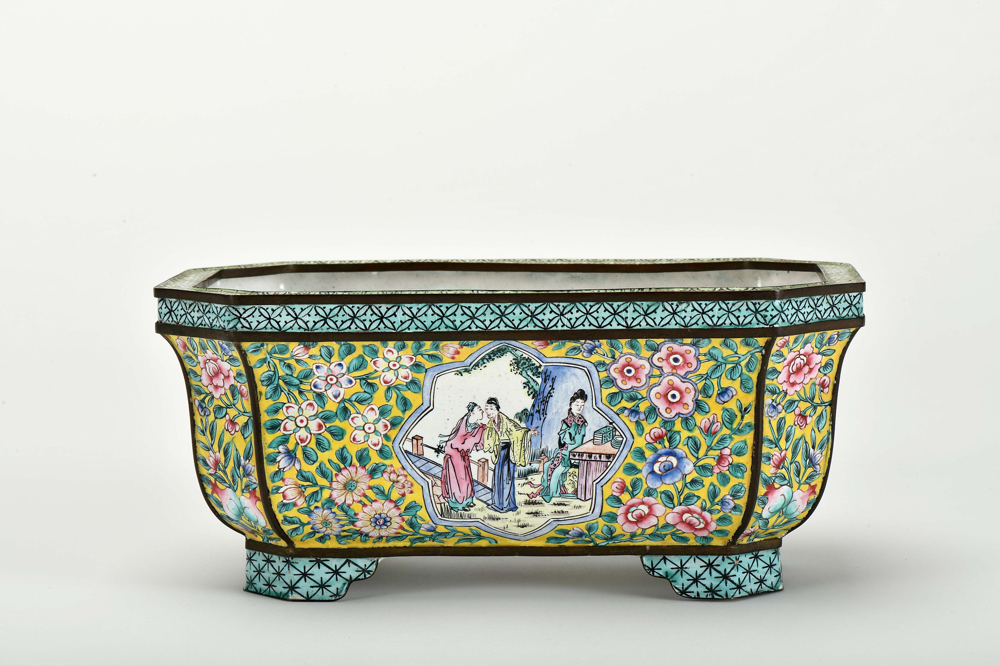 Floreira cobre esmaltado decoração policromada "Flores" sobre fundo amarelo com reservas policromadas "Figuras chinesas" Chinesa - reinado Guangxu (1875-1908) marcada Dimensões (altura x comprimento x largura) - 9,7 x 22,2 x 13,9 cm