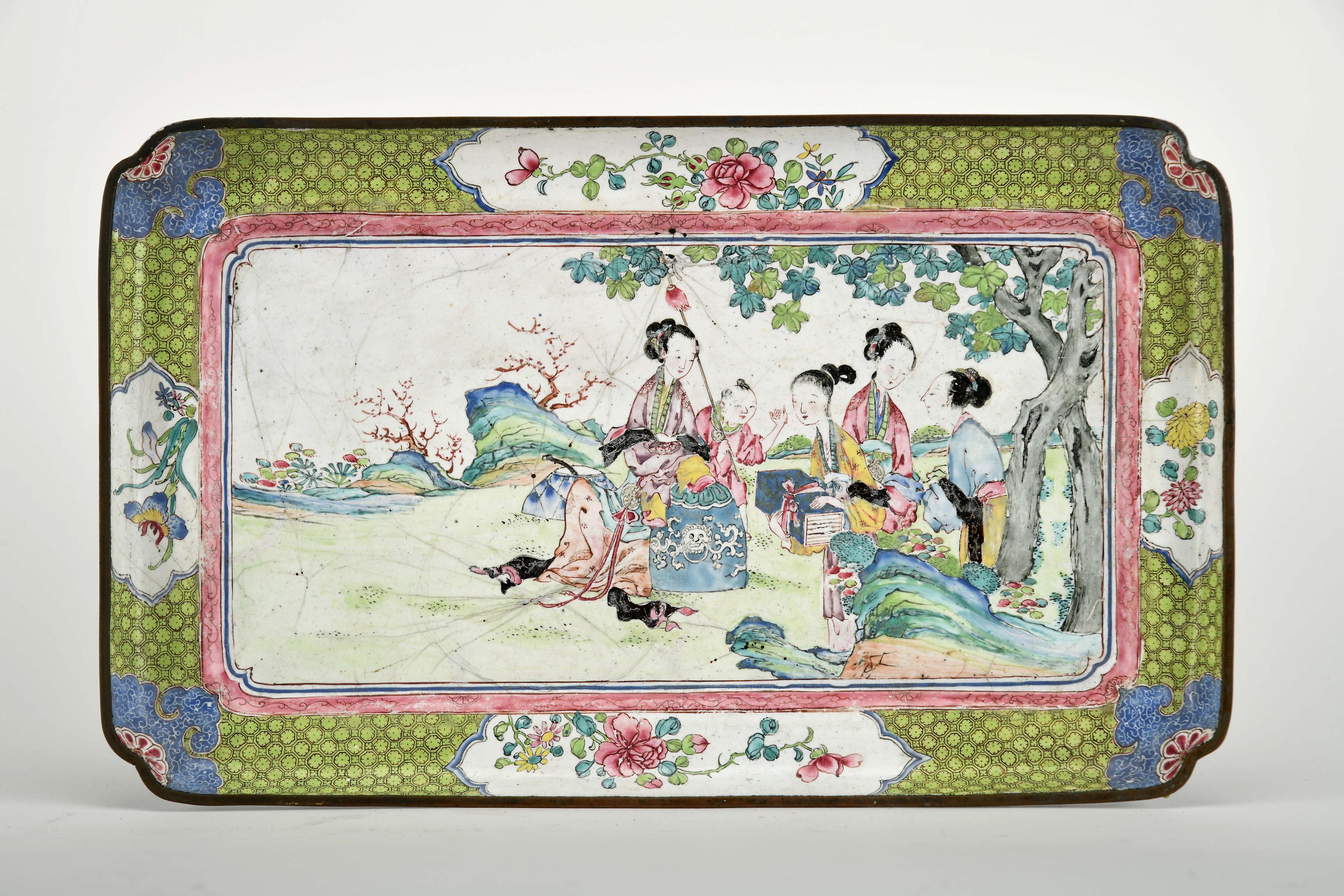 Bandeja rectangular cobre esmaltado decoração policromada "Paisagem com figuras chinesas", aba com reservas policromadas "Flores", verso da aba com decoração a azul com reservas policromadas "Flores" e centro com decoração policromada "Flor" Chinesa - reinado Qianlong (1736-1795) restauros, esmalte com craquelé Dimensões (altura x comprimento x largura) - 30,5 x 19 cm Notas: vd. WELSH, Jorge; VINHAIS, Luísa - "China of All Colours: Painted Enamels on Copper". Londres & Lisboa: Jorge Welsh Works of Art, 2015, pp. 102 e 116-123, nºs 19 e 26-27.