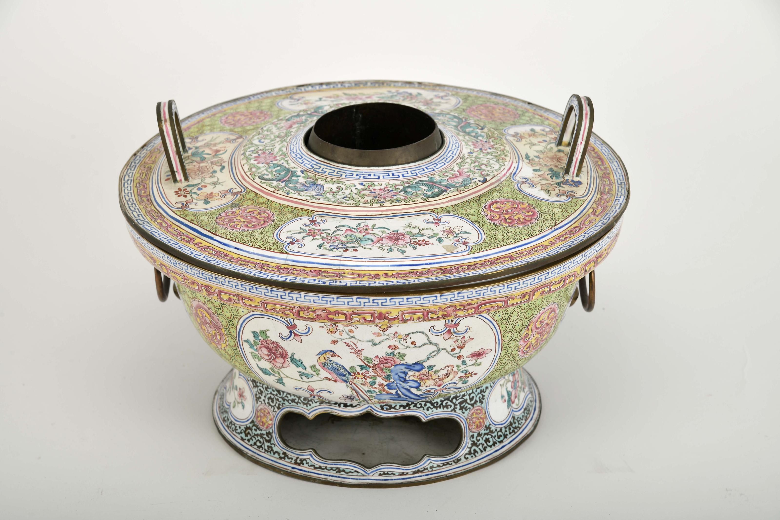 Fondue chinoise cobre esmaltado decoração policromada "Flores" com reservas policromadas "Aves, frutos e flores" Chinês - reinado Jiaqing (1796-1820) restauros, esmalte com algum craquelé Dimensões (altura x comprimento x largura) - 20,5 x 30 cm