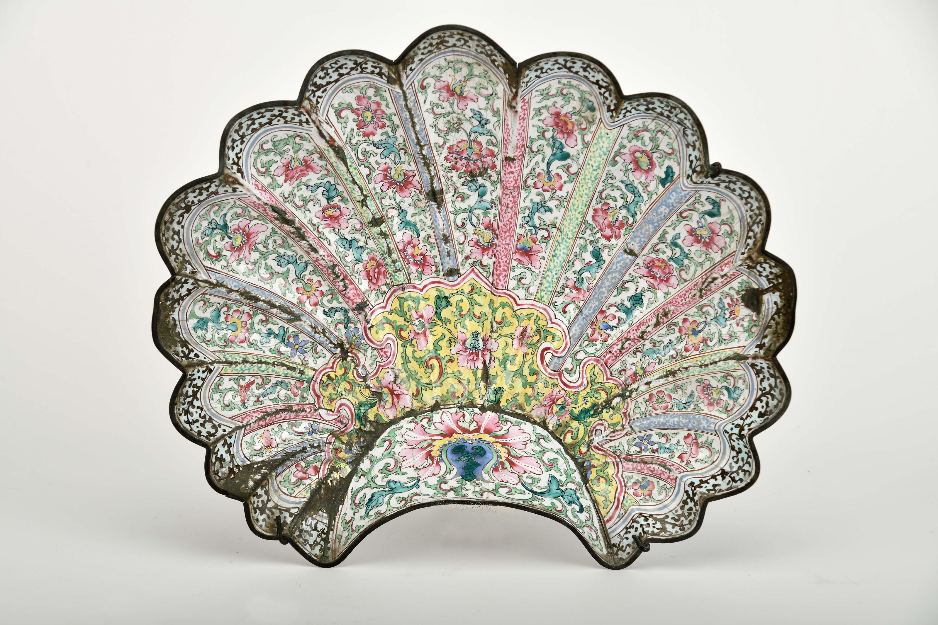 Lavanda "Concha" com três pés cobre esmaltado decoração policromada "Flores", verso com decoração policromada "Flores" Chinesa - reinado Qianlong (1736-1795) amolgadelas, faltas no esmalte, abas com muito desgaste no esmalte, verso com craquelé Dimensões (altura x comprimento x largura) - 8 x 34,5 x 31 cm Notas: vd. WELSH, Jorge; VINHAIS, Luísa - "China of All Colours: Painted Enamels on Copper". Londres & Lisboa: Jorge Welsh Works of Art, 2015, pp. 200-210, nºs 56 a 59.
