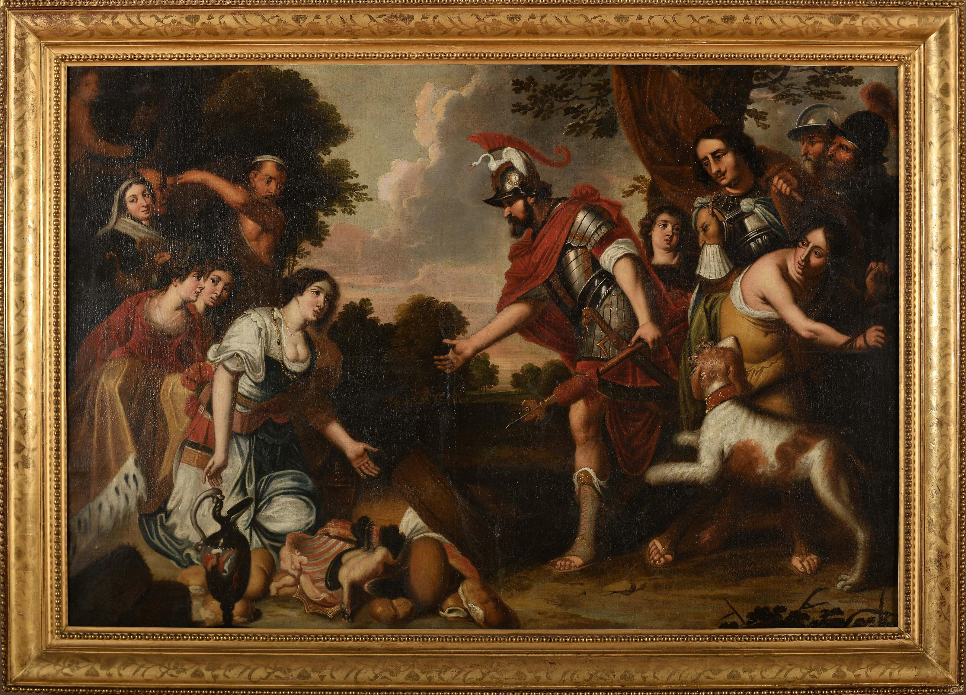O encontro de Abigail e David óleo sobre tela segundo pintura original de Theodoor Rombouts (1597-1637) que se encontra no Museu de Belas Artes em Budapeste escola Flamenga séc. XVII reentelado, restauros Dimensões (altura x comprimento x largura) - 115 x 170 cm
