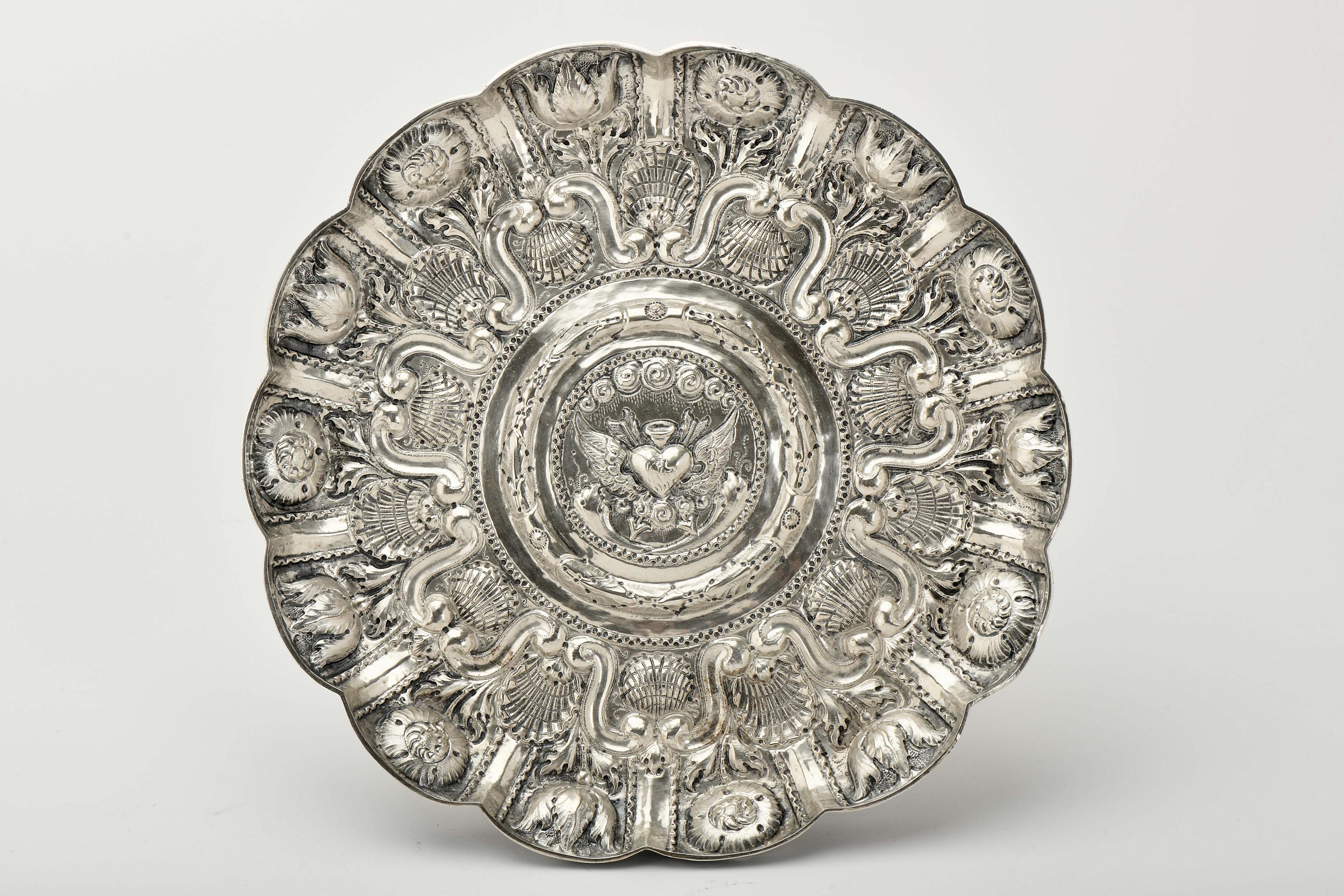 Salva de casamento D. João V (1706-1750) prata de 854/1000 decoração relevada "Flores e conchas" com reserva central "Coração alado trespassado por flechas", verso gravado com marca de posse - escudo esquartelado: I Barros; II Ferrão (?); III Silva (?); IV ?; elmo e timbre de Barros (de Francisco de Barros) Portuguesa marca de ensaiador de Lisboa (1727-1755), marca de ourives atribuível a Eugénio da Costa, remarcada com Cabeça de Velho Dimensões (altura x comprimento x largura) - 26 cm; Peso - 238 g. Notas: verso com etiqueta do leilão da Colecção Francisco Hipólito Raposo - Palácio do Correio Velho.Vd. ALMEIDA, Fernando Moitinho de; CARLOS, Rita - "Inventário de Marcas de Pratas Portuguesas e Brasileiras - Século XV a 1887". Lisboa: IN-CM, 2018, L-25 e L-246.