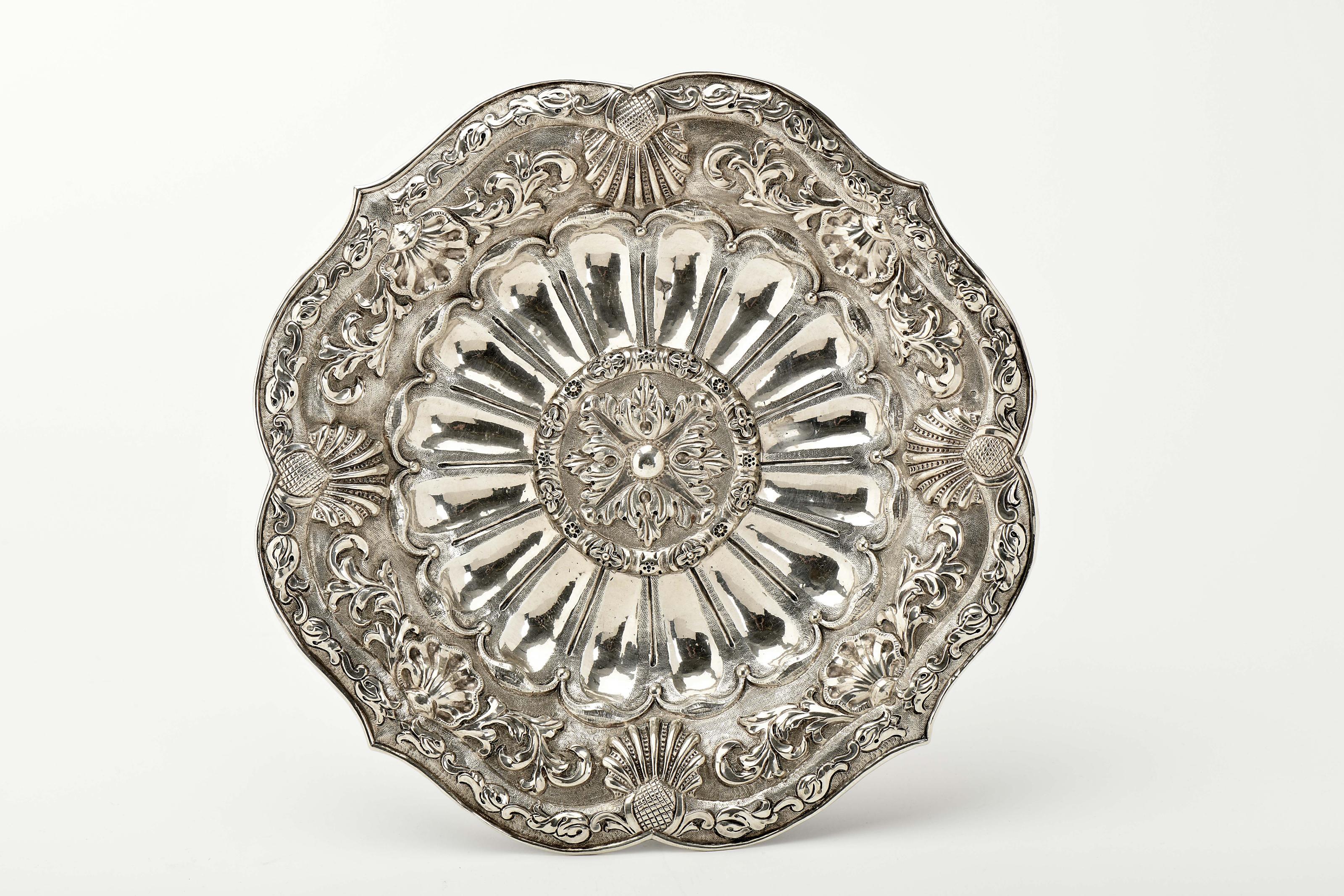 Salva de aparato recortada D. João V (1706-1750) prata decoração relevada "Motivos vegetalistas e concheados" Portuguesa marca de reconhecimento de Lisboa (1887) Dimensões (altura x comprimento x largura) - 29 cm; Peso - 426 g.