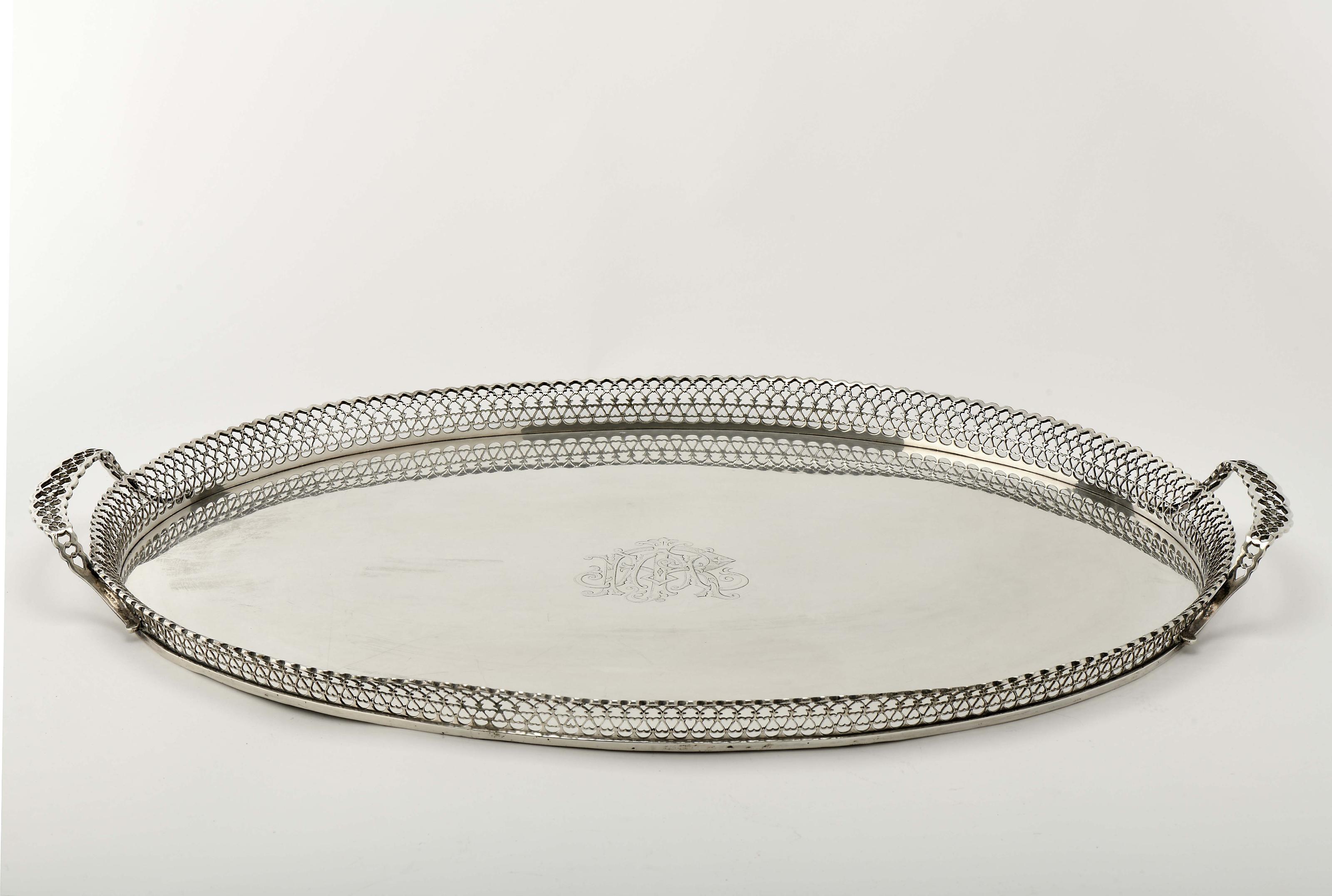Bandeja oval de gradinha com duas pegas D. Maria I (1777-1816) prata de 854/1000 fundo gravado com monograma RAJ Portuguesa fundo com marca de ensaiador do Porto (1810-1839) e marca de ourives atribuível a Pedro José Ferreira (1812-1843), gradinha com marca de ensaiador de Lisboa (1822-1860) e marca de ourives atribuível a João Ramos Ortiz (1810-1879) Dimensões (altura x comprimento x largura) - 6 x 82 x 55,5 cm; Peso - 5.683 g. Notas: vd. ALMEIDA, Fernando Moitinho de; CARLOS, Rita - "Inventário de Marcas de Pratas Portuguesas e Brasileiras - Século XV a 1887". Lisboa: IN-CM, 2018, P-28, P-546, L-42 e L-445.