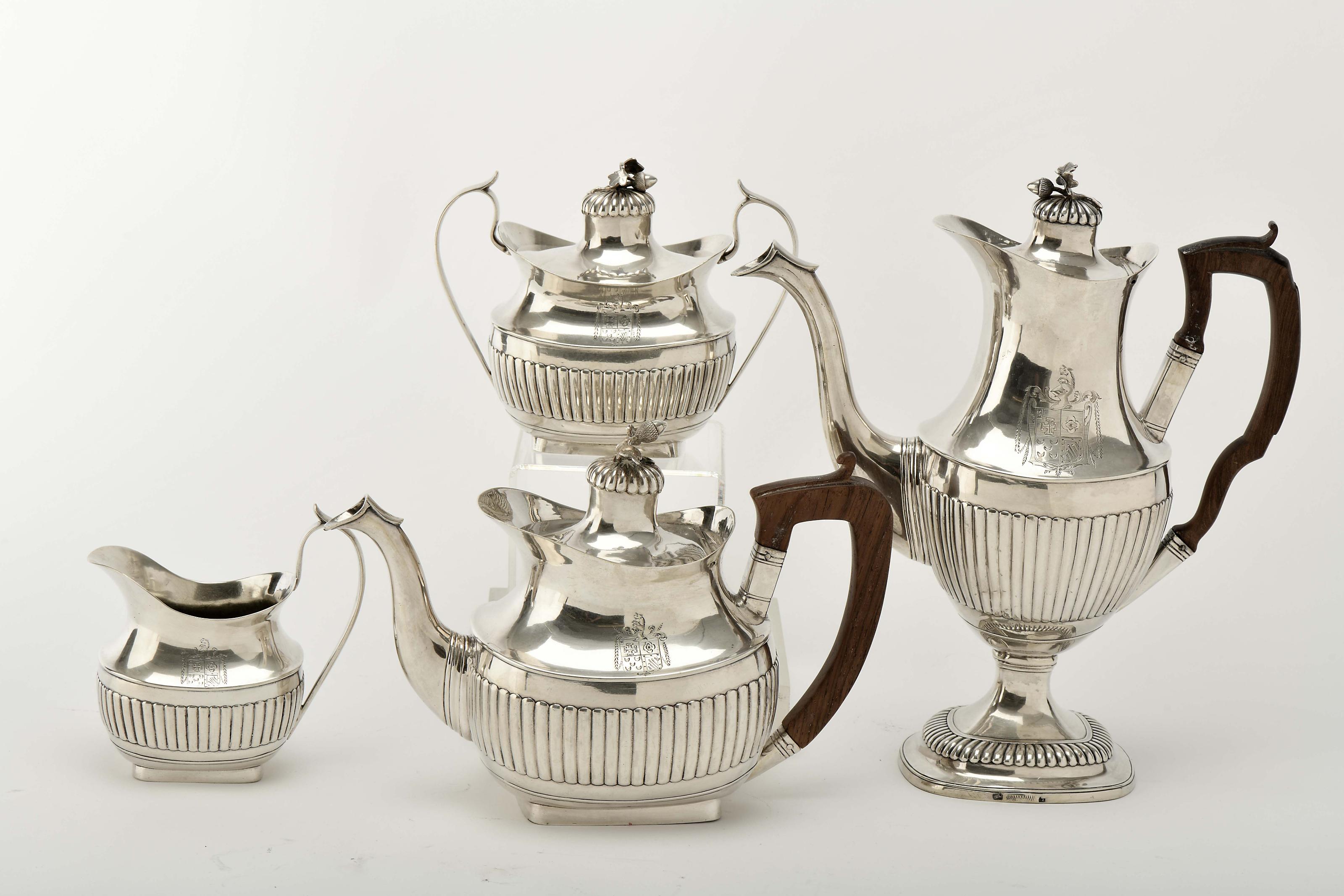 Serviço de chá e de café D. Maria I (1777-1816) prata de 854/1000 composto por bule, cafeteira, leiteira e açucareiro, decoração gomada, pomos das tampas relevados "Bolota e folhas", pegas em pau-santo, gravação com brasão - escudo esquartelado: I Teixeira com diferença; II Carvalho; III Pinto; IV Mesquita; elmo, paquife e timbre de Teixeira - armas concedidas a 6-9-1761 a Manuel Luís Teixeira de Carvalho da Cunha Pinto da Mesquita (1743-?), senhor da Casa da Boavista, em Veade, Celorico de Basto Português sinais de uso marca de ensaiador do Porto (1810-1839), marca de ourives atribuível a José Ferreira Guimarães (1799-1842) Dimensões (altura x comprimento x largura) - (cafeteira) 32 cm; Peso - (bruto) 3.124 g. Notas: vd. ALMEIDA, Fernando Moitinho de; CARLOS, Rita - "Inventário de Marcas de Pratas Portuguesas e Brasileiras - Século XV a 1887". Lisboa: IN-CM, 2018, P-28 e P-268; e SOUSA, Gonçalo de Vasconcelos e - “Dicionário de ourives e lavrantes da prata do Porto, 1750-1825”, Civilização Editora, 2005, pp. 238 a 240.