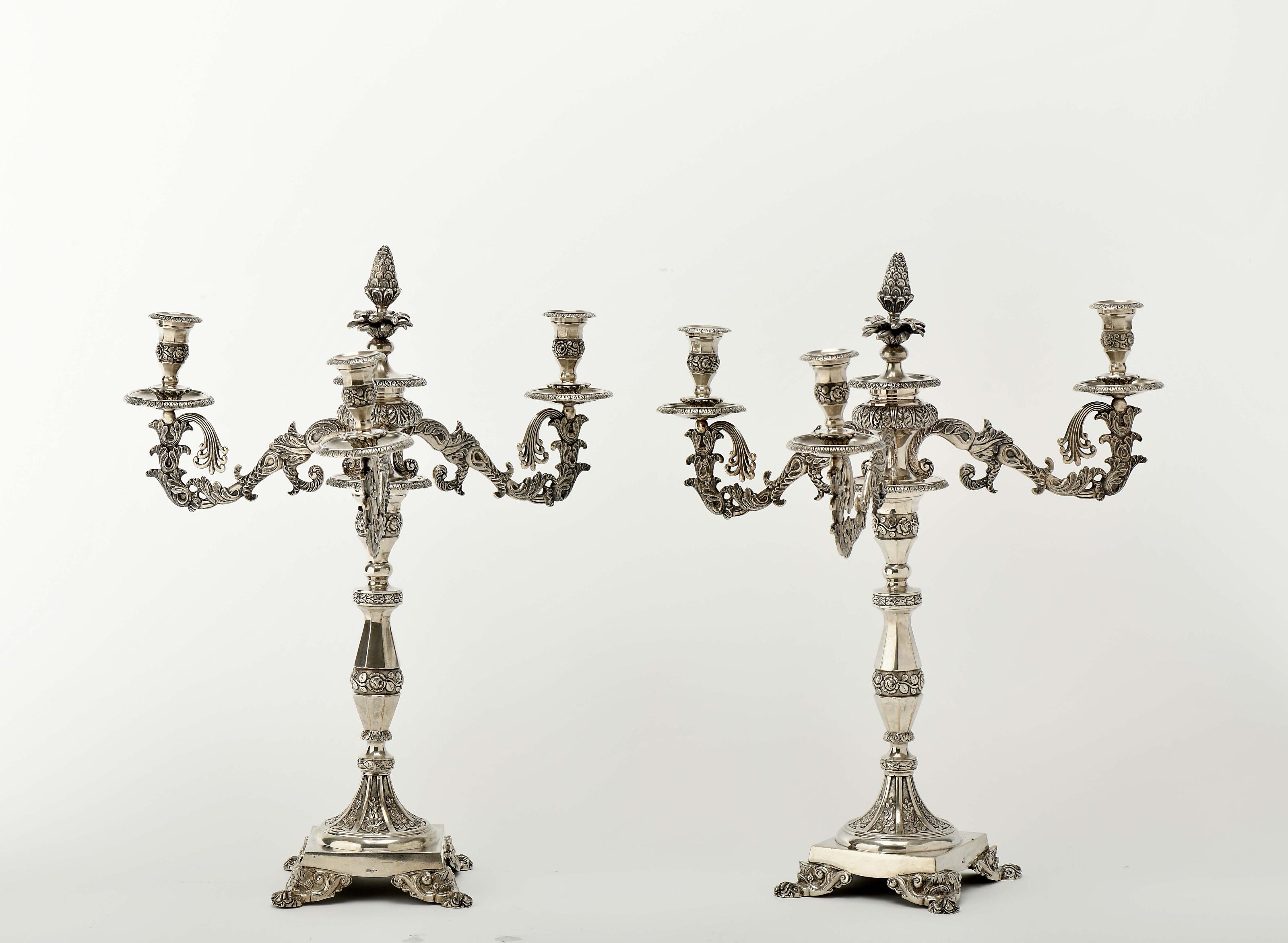 Par de castiçais com serpentinas de quatro lumes prata e prata de 854/1000 decoração relevada "Flores e motivos vegetalistas", tapa-lumes relevadas "Fruto e folhas" Portugueses pequenos restauros e defeitos castiçais com marca de ensaiador de Lisboa (1843-1870), marca de ourives atribuível a Victor Ângelo Dinis (1825-1857), marcados com Cabeça de Velho, serpentinas portuguesas da mesma época sem marcas, ao abrigo do Decreto-Lei nº 120/2017, de 15 de Setembro - art. 2º, nº 2, alínea c), serpentinas com marca de importação holandesa (c. 1953) Dimensões (altura x comprimento x largura) - 48,5 cm; Peso - 6.208 g. Notas: vd. ALMEIDA, Fernando Moitinho de; CARLOS, Rita - "Inventário de Marcas de Pratas Portuguesas e Brasileiras - Século XV a 1887". Lisboa: IN-CM, 2018, L-44 e L-613.