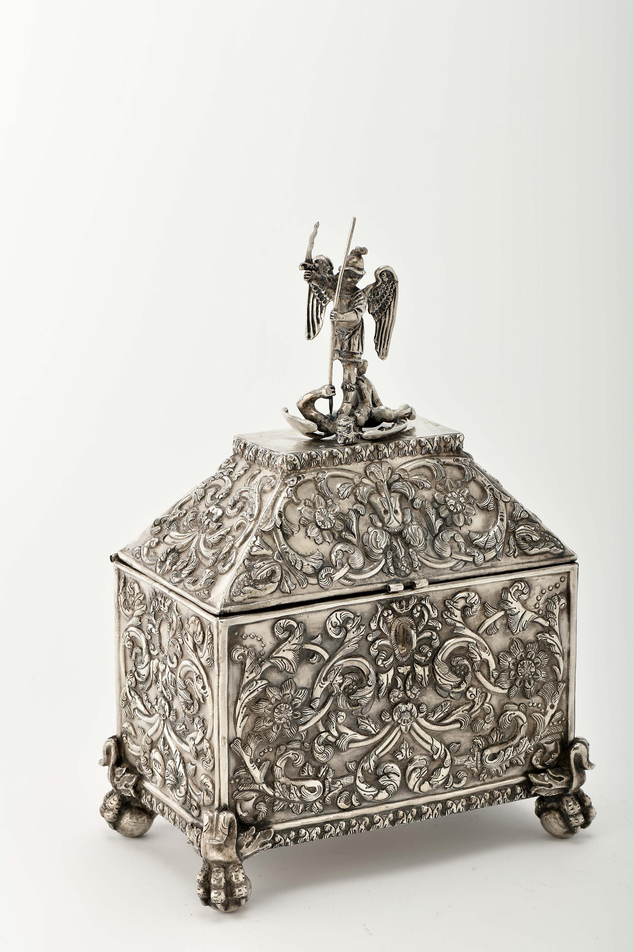 Cofre de tampa tronco-piramidal prata decoração relevada "Flores e enrolamentos vegetalistas", topo da tampa encimada por escultura "São Miguel Arcanjo matando o Diabo", pés de «garra-e-bola», interior forrado a veludo vermelho Colonial Espanhol séc. XVIII/XIX falta do batente da fechadura, amolgadelas sem marcas, ao abrigo do Decreto-Lei nº 120/2017, de 15 de Setembro - art. 2º, nº 2, alínea c) Dimensões (altura x comprimento x largura) - 36 x 25 x 16 cm; Peso - (prata) 2.479 g.