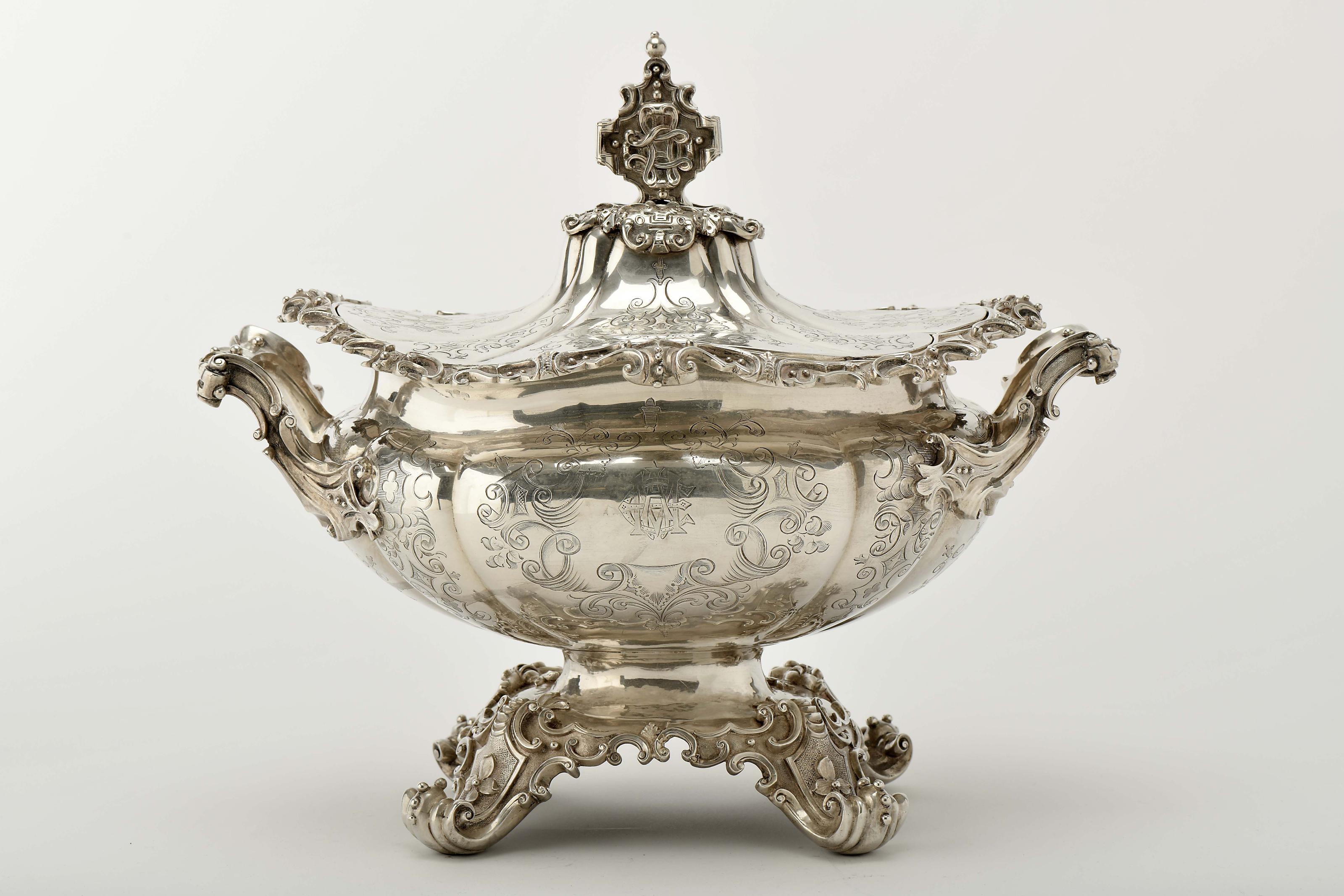 Terrina com quatro pés victoriana (1837-1901) prata de 925/1000 decoração relevada e gravada com monograma EMA Inglesa marca da cidade de Londres (1865-1866), marca de ourives de Samuel Hayne & Dudley Cater, sem marcas portuguesas, ao abrigo do Decreto-Lei nº 120/2017, de 15 de Setembro - art. 2, nº 2, alínea c) Dimensões (altura x comprimento x largura) - 35 x 39,5 x 25,5 cm; Peso - 3.494 g.