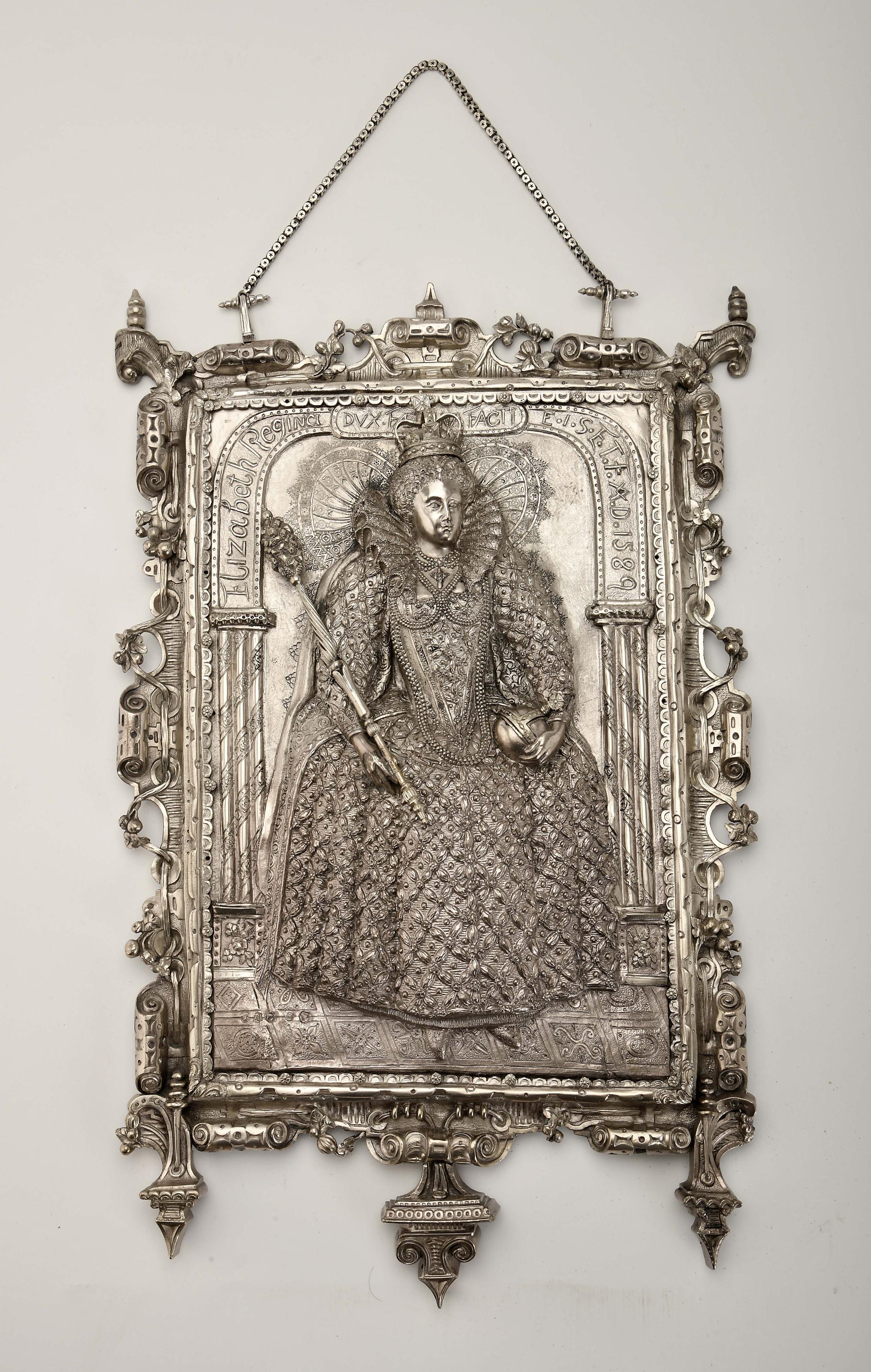 Rainha Isabel I de Inglaterra (1558-1603) placa em prata relevada de 925/1000 inscrição ELIZABETH REGINA DVX FAEMINA FACTI E.I.S.E.T.F.A.D. 1589 séc. XX (meados) pequenos defeitos e amolgadelas marcas fantasistas, remarcada com marca da cidade de Birmingham (1954), sem marcas portuguesas, ao abrigo do Decreto-Lei nº 120-2017, de 15 de Setembro – art. 2º, nº 2, alínea c) Dimensões (altura x comprimento x largura) - 48 x 31 cm; Peso - 2.572 g.