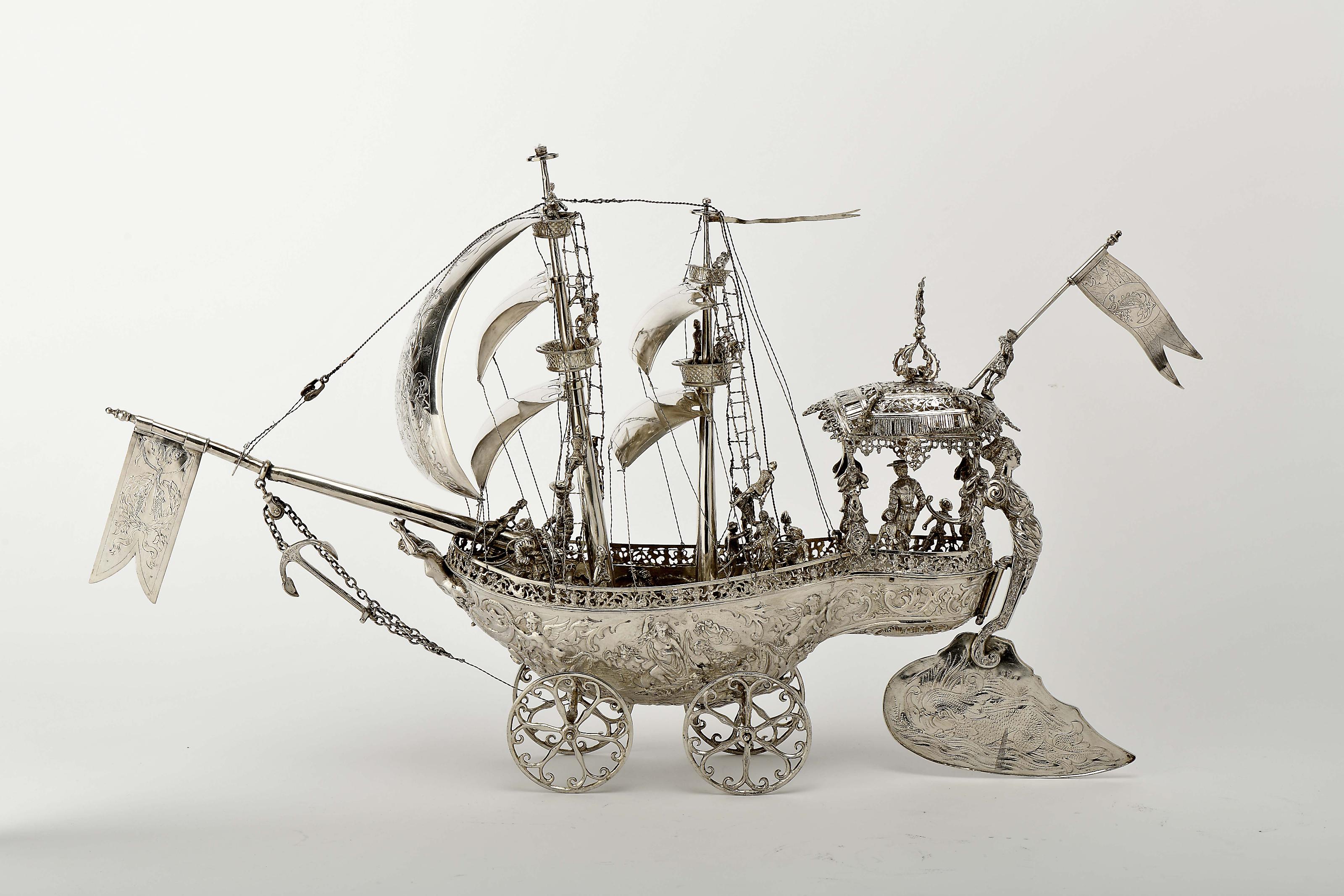 Nau prata decoração relevada e gravada "Figuras mitológicas, sereia e golfinhos", vela gravada com armas de família europeia Alemã séc. XIX/XX pequenas faltas, defeitos e amolgadelas marcas fantasistas de Hanau, remarcada com marca de importação inglesa, sem marcas portuguesas, ao abrigo do Decreto-Lei nº 120/2017, de 15 de Setembro - art. 2º, nº 2, alínea c) Dimensões (altura x comprimento x largura) - 43 x 78 x 13,5 cm; Peso - 3.692 g.