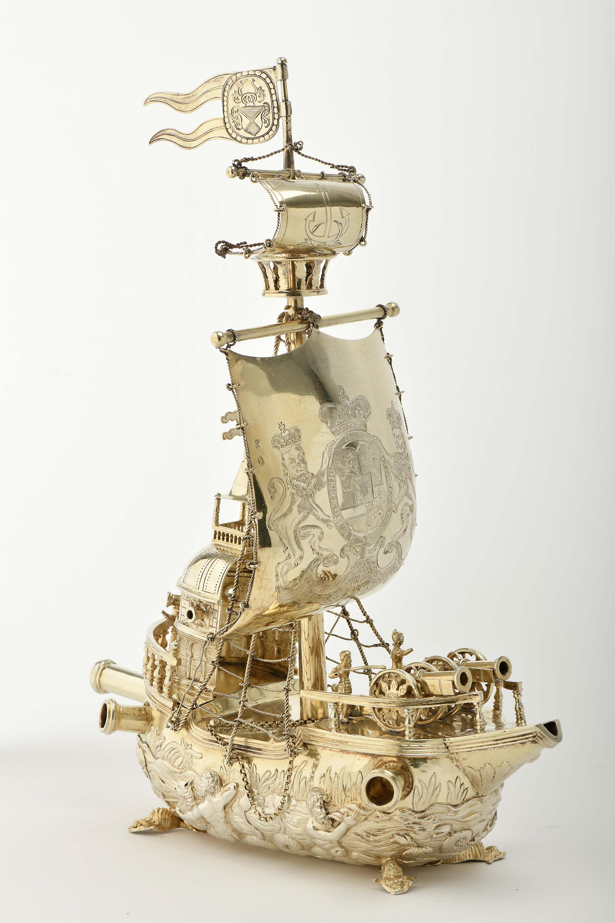 Nau prata dourada decoração relevada "Figuras mitológicas, anjo e animais fantásticos", pés relevados "Golfinhos", vela gravada com armas suportadas por leões coroados e encimada por coroa de príncipe e divida HONI SOIT QUI MAL Y PENSE - armas da casa de Nassau Alemã séc. XIX/XX pequenos restauros e amolgadelas marcas fantasias de Hanau, sem marcas portuguesas, ao abrigo do Decreto-Lei nº 120/2017, de 15 de Setembro - art. 2º, nº 2, alínea c) Dimensões (altura x comprimento x largura) - 36,3 x 27 x 13 cm; Peso - 1.187 g.