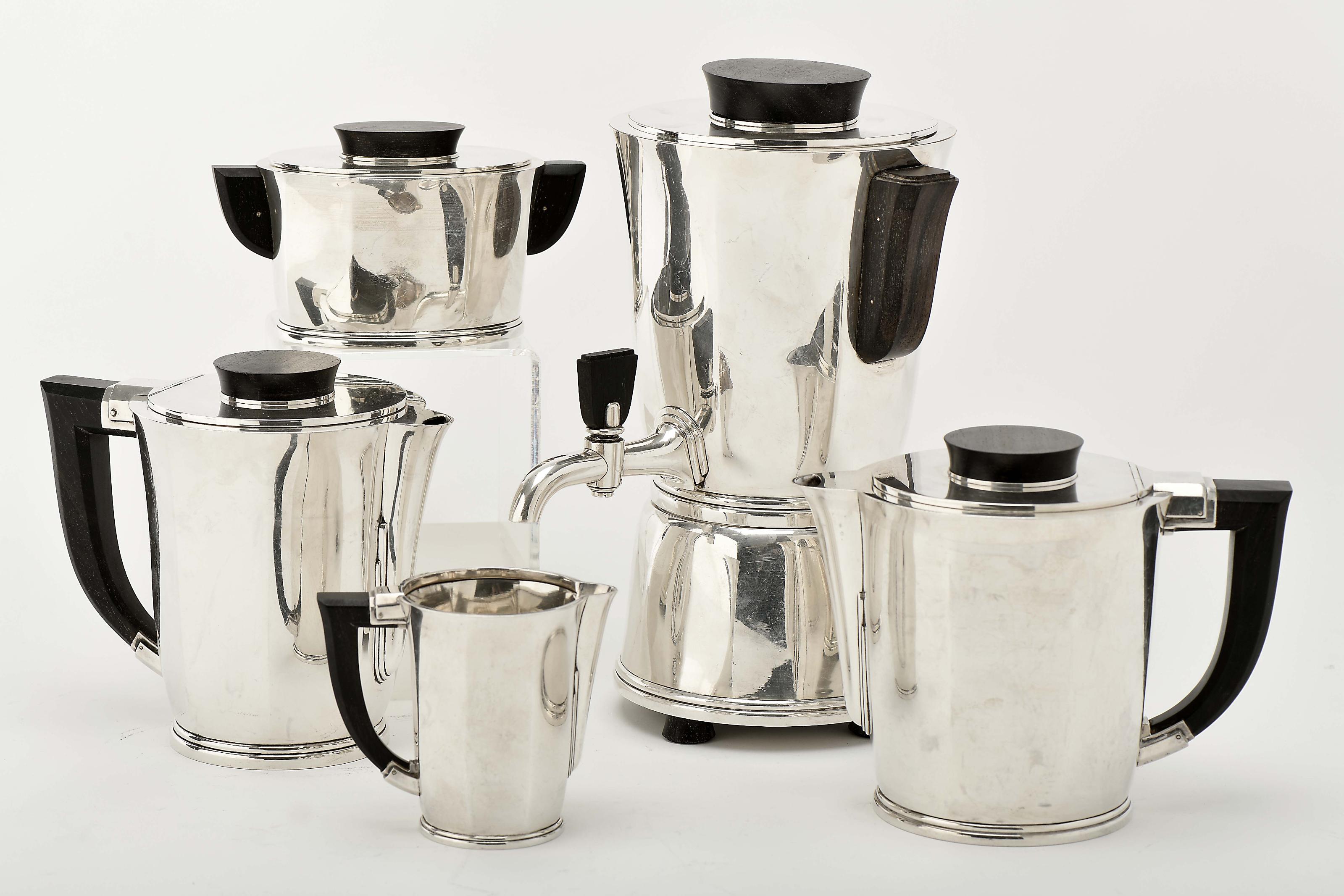 Serviço de chá e de café com samovar Art Déco prata de 950/1000 composto por samovar com escalfador, bule, cafeteira, leiteira e açucareiro, pegas e pomos das tampas em ébano, escalfador com sistema de aquecimento eléctrico Francês pequenas amolgadelas, escalfador com sistema de aquecimento eléctrico não testado marca de garantia de teor, marca de ourives de Jacques & Pierre Cardeilhac (1904-1951) e marca comercial de CARDEILHAC - PARIS, sem marcas portuguesas, ao abrigo do Decreto-Lei nº 120/2017, de 15 de Setembro - art. 2º, nº 2, alínea c) Dimensões (altura x comprimento x largura) - (samovar) 27,5 cm; Peso - (bruto) 4.314 g.