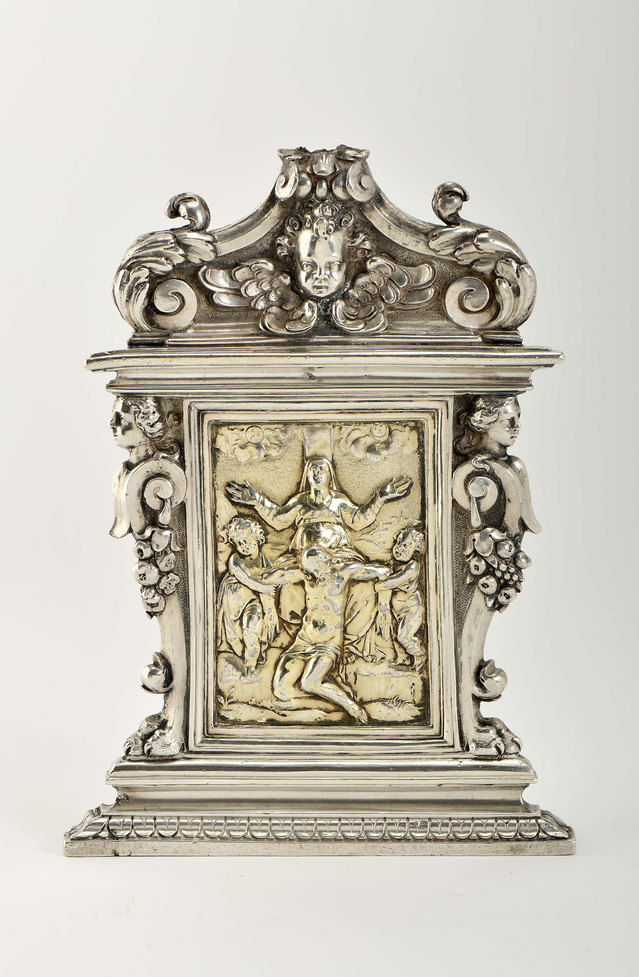 Porta-paz "Pietà" prata e prata dourada decoração relevada "Querubim e cariátides", pega relevada "Cariátide alada" Espanhol séc. XVIII falta do topo da cimalha e de um parafuso na pega, pequenas fissuras e amolgadelas sem marca de ensaiador, marca de ourives de Salamanca de Juan Sanz, sem marcas portuguesas, ao abrigo do Decreto-Lei nº 120/2017, de 15 de Setembro - art. 2º, nº 2, alínea c) Dimensões (altura x comprimento x largura) - 18,5 x 13,4 x 7,2 cm; Peso - 547 g.