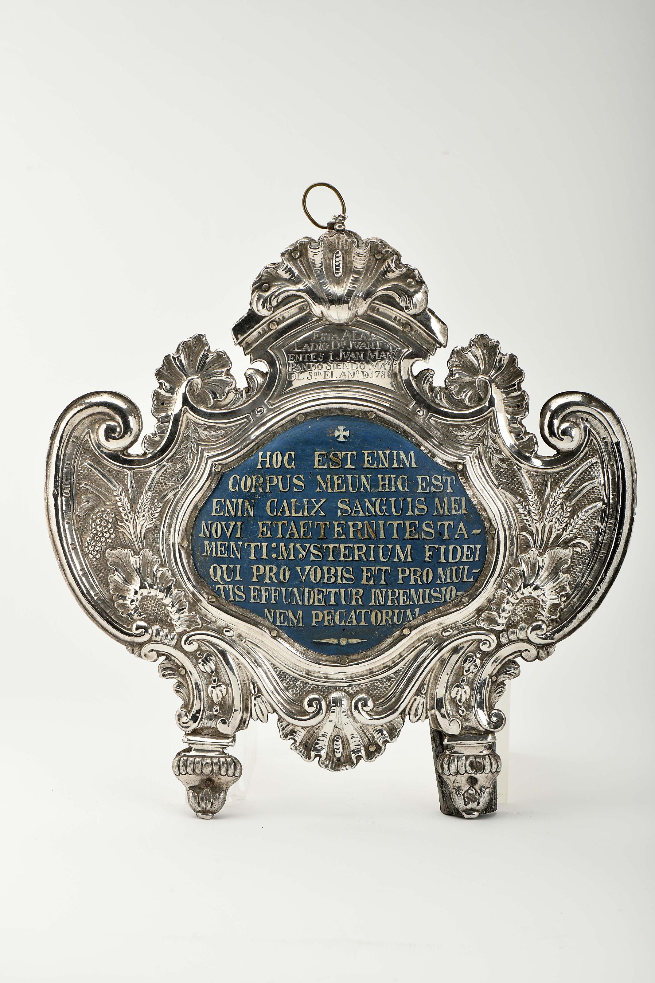Sacra moldura em chapa de prata relevada "Espigas, uvas, folhas e concheados" cimalha com inscrição ESTA ALAJA LA DIO Dᴺ. JVAN FVLENTES I JVAN MAN. PANDO SIENDO MAᴹᴼˢ. DEL Sᴼᴿ. EL ANº DE 1788, centro em madeira pintada com inscrição em latim, verso em madeira com argola para suspensão Espanhola pequenas faltas e defeitos, amolgadelas, restauro na estrutura de madeira de um pé, verso com vestígios de insectos xilófagos marca de ensaiador de Salamanca Silva (1789) e marca de ourives ilegível, sem marcas portuguesas, ao abrigo do Decreto-Lei nº 120/2017, de 15 de Setembro - art. 2º, nº 2, alínea c) Dimensões (altura x comprimento x largura) - 42 x 41 cm; Peso - (bruto) 1.459 g. Notas: integrou a Colecção de Duarte Pinto Coelho, Madrid, sendo o lote nº 607 do Leilão realizado pela Christie's em julho de 2011.