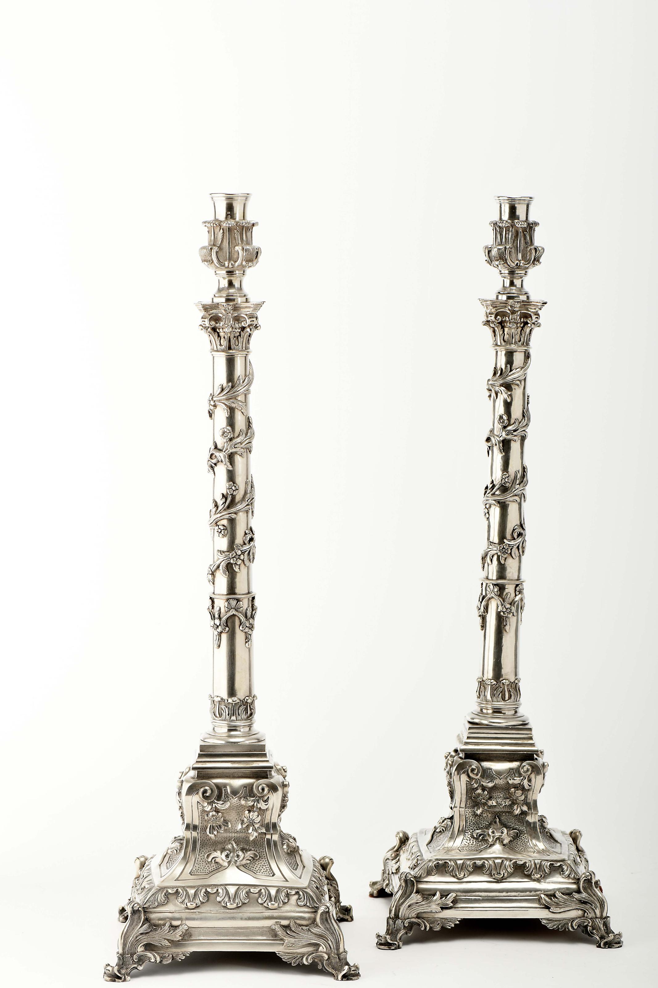 Par de tocheiros grandes prata decoração relevada "Capitéis coríntios e motivos vegetalistas", interior com espigão em ferro e alma em madeira Brasileiros séc. XIX um com muitas amolgadelas e restauros, outro com pequenas amolgadelas um com marca de garantia de teor de dez dinheiros do Rio de Janeiro e marca de António José Moreira Soares (1855-1875), outro sem marcas, ao abrigo do Decreto-Lei nº 120/2017, de 15 de Setembro - art. 2º, nº 2, alínea c) Dimensões (altura x comprimento x largura) - 72 cm; Peso - (bruto) 8.780 g. Notas: vd. ALMEIDA, Fernando Moitinho de; CARLOS, Rita - "Inventário de Marcas de Pratas Portuguesas e Brasileiras - Século XV a 1887". Lisboa: IN-CM, 2018, BR-119 e BR-180a.