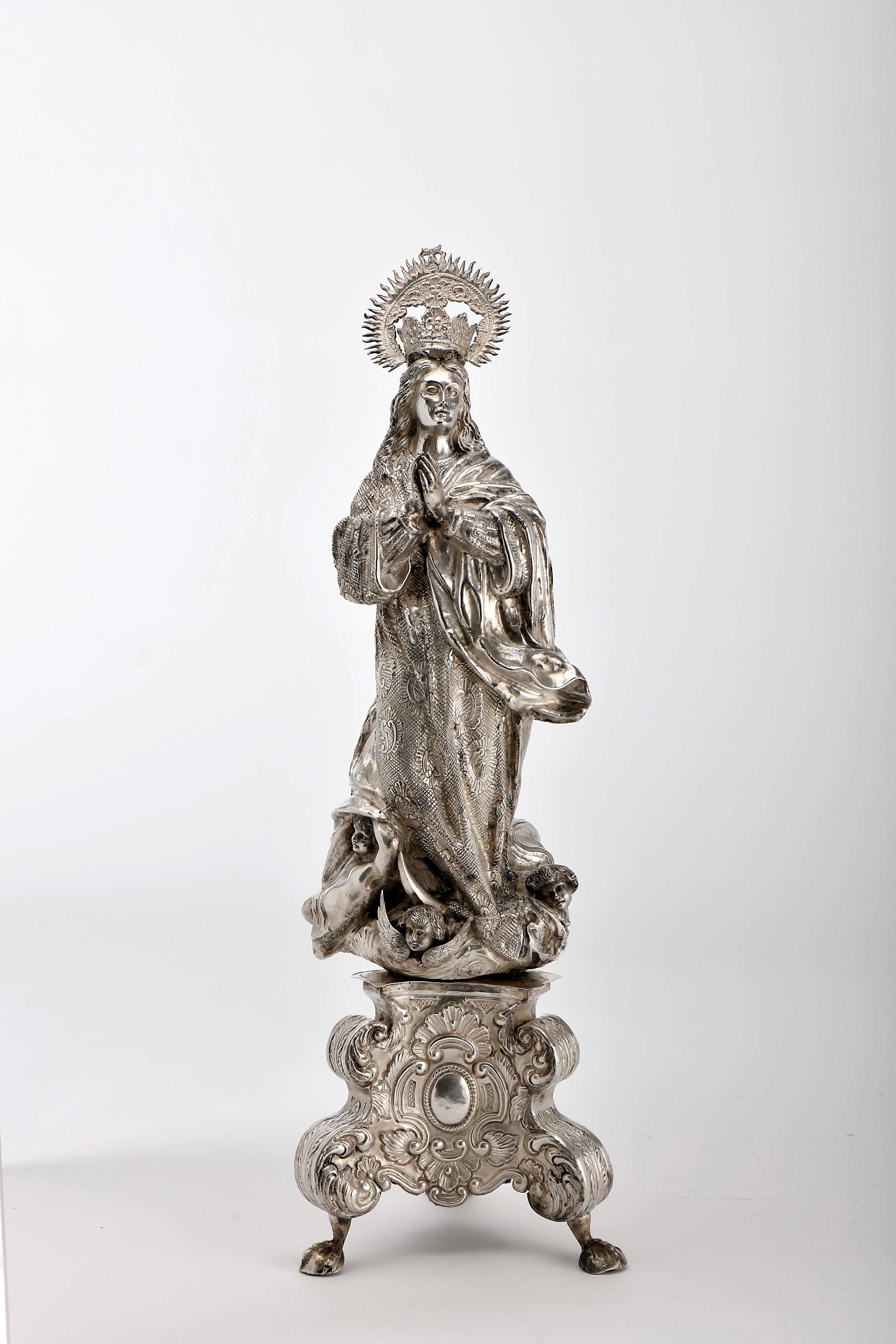 Nossa Senhora da Conceição escultura em chapa de prata base triangular em prata relevada e gravada "Conchas e motivos vegetalistas" com pés de «garra-e-bola», interior em madeira Espanhola séc. XVIII restauros, amolgadelas, pequenas faltas e defeitos sem marcas, ao abrigo do Decreto-Lei nº 120/2017, de 15 de Setembro - art. 2º, nº 2, alínea c) Dimensões (altura x comprimento x largura) - (total) 61 cm; Peso - (prata mais espigão central de ferro) 1.836 g.