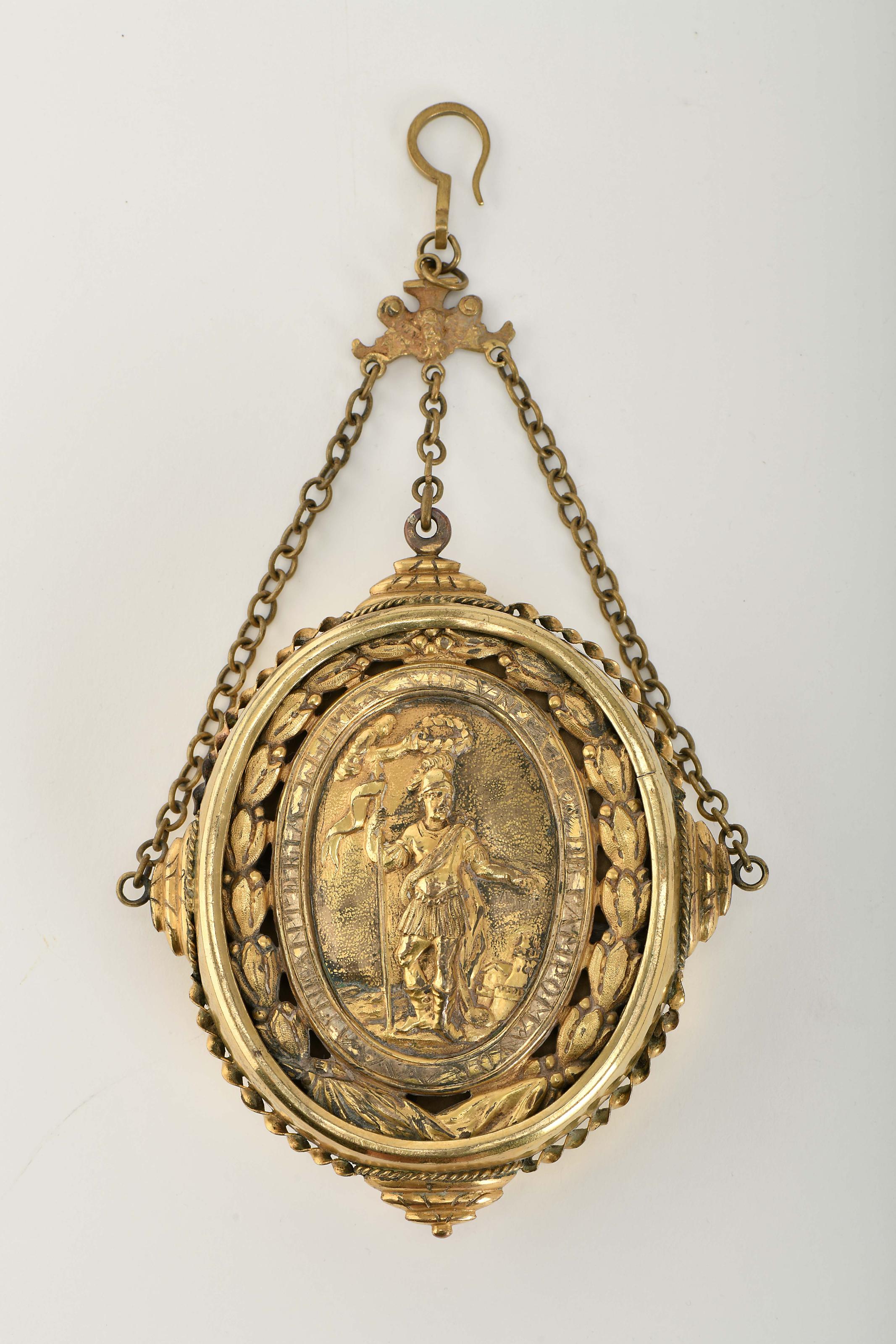 Pendente - Regimento de Infantaria de Campo Maior metal dourado decoração relevada e vazada "Soldado" com inscrição YNFANTERIA LIJERA VOLVNTARIOS DE CAMPOMAYOR, verso com gravura colorida sobre papel "Papa" Portuguesa séc. XVIII (1º quartel) pequenos defeitos, faltas na moldura Dimensões (altura x comprimento x largura) - 15 x 13 x 3,5 cm Notas: O Regimento de Infantaria de Campo Maior, também conhecido como Regimento de Infantaria nº 20, teve origem nos Terços organizados em 1641. Em 1762, foi desdobrado, originando os regimentos de Manuel Pereira de Matos e de Pascoal Pepper, mas foi reagrupado no ano seguinte. Em 1806, passou a ser designado como Regimento de Infantaria nº 20.