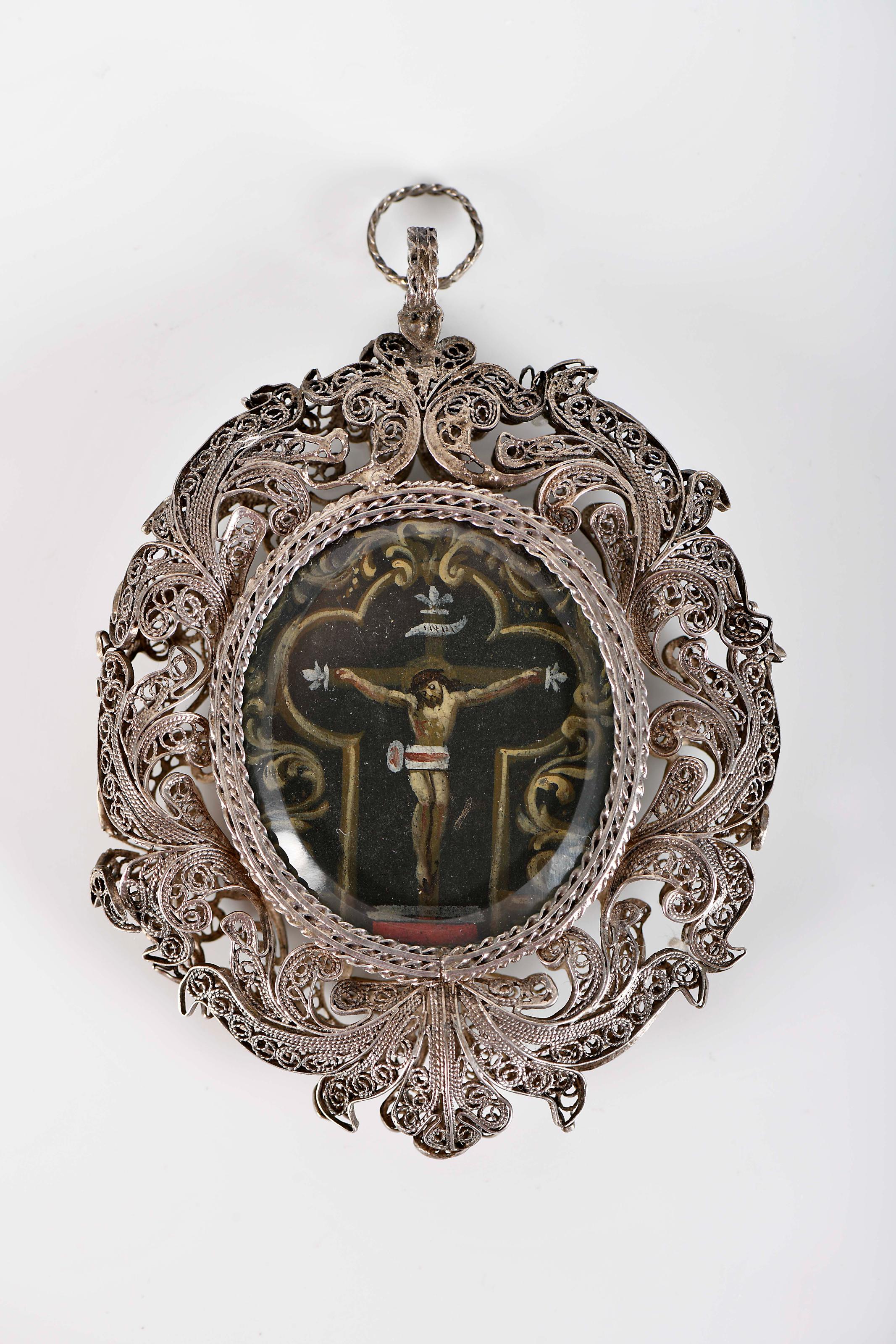 Pendente - Cristo crucificado e Nossa Senhora coroada óleo sobre cobre e pintura sobre papel moldura em prata filigranada Espanhol séc. XVII/XVIII pequenas faltas e defeitos na camada pictórica e na moldura prata sem marcas, ao abrigo do Decreto-Lei nº 120/2017, de 15 de Setembro - art. 2º, nº 2, alínea c) Dimensões (altura x comprimento x largura) - 9,5 x 7,2 x 1,5 cm