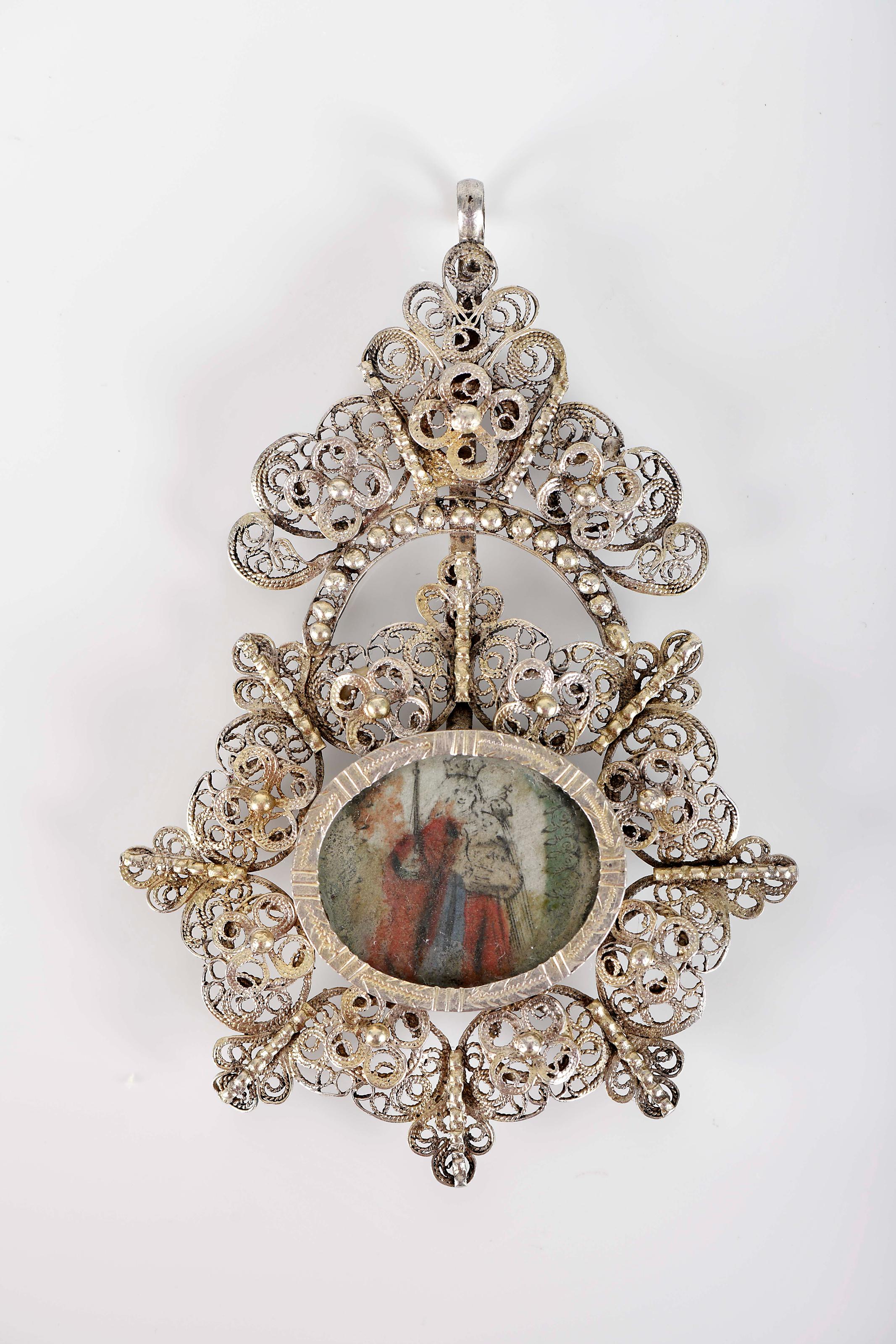 Pendente - Nossa Senhora com o Menino Jesus coroados e Nosso Senhor duas gravuras aguareladas sobre papel moldura em filigrana de prata Espanhol séc. XVIII manchas no papel prata sem marcas, ao abrigo do Decreto-Lei nº 120/2017, de 15 de Setembro - art. 2º, nº 2, alínea c) Dimensões (altura x comprimento x largura) - 10,5 x 7 x 1 cm
