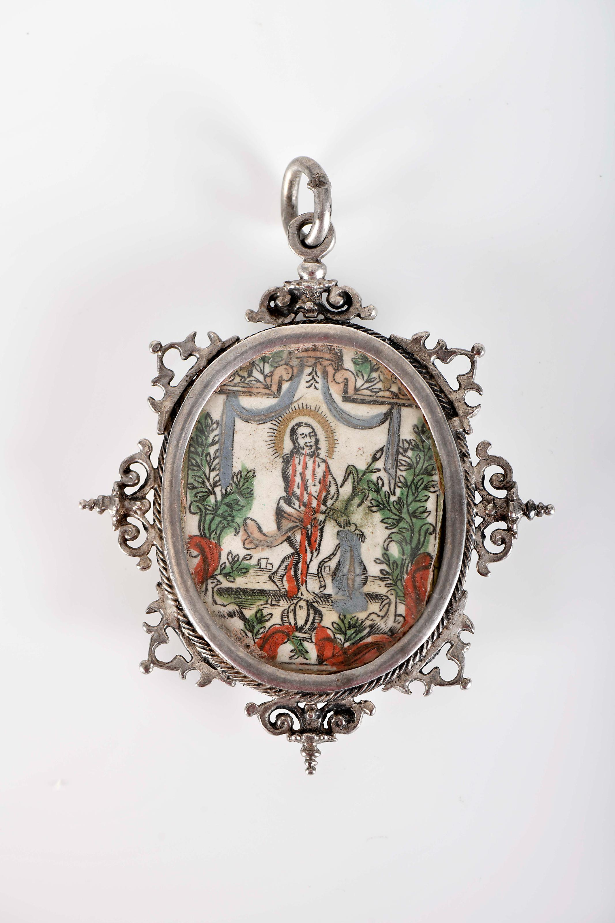 Pendente - Cristo atado à coluna e Cristo crucificado duas pinturas sobre pergaminho moldura em prata recortada, relevada e vazada Espanhol séc. XVII pequenas manchas no pergaminho prata sem marcas, ao abrigo do Decreto-Lei nº 120/2017, de 15 de Setembro - art. 2º, nº 2, alínea c) Dimensões (altura x comprimento x largura) - 8,5 x 7 x 1,5 cm