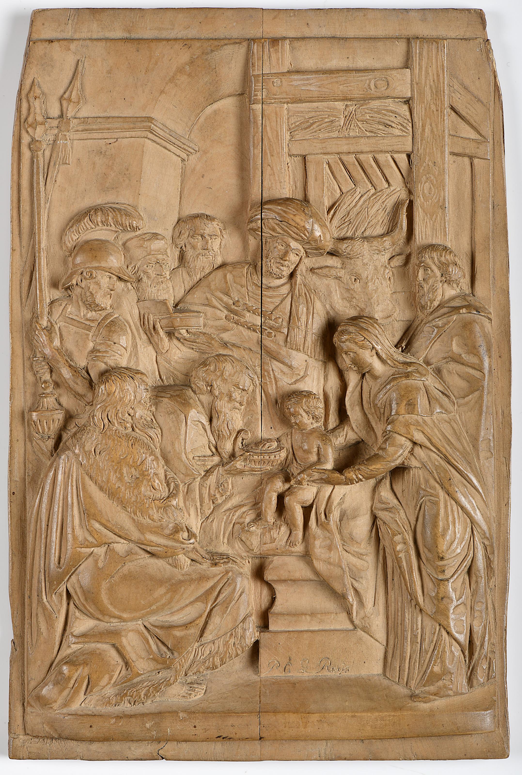 PEDRO CARLOS QUÁDRIO DOS REIS - 1819-1893 Adoração dos Magos placa em buxo esculpido em «baixo-relevo» fissura na junção das duas tábuas assinada Dimensões (altura x comprimento x largura) - 19,5 x 13,2 cm Notas: filho e discípulo do escultor portuense Constantino José Quádrio dos Reis, foi autor do monumento a Bocage erigido em Setúbal tendo realizado o baixo-relevo "Combate das Amazonas" (cópia da pintura de Rubens). Diversos desenhos integram o espólio do Museu Convento de Jesus, Setúbal - vd. PAMPLONA, Fernando de - "Dicionário de Pintores e Escultores Portugueses ou que trabalharam em Portugal" - vol. V. Porto: Civilização Editora, 1988 (2ª edição), p. 40; e https://repositorio.ulisboa.pt/bitstream/10451/6546/2/ULFBA_TES493.pdf - consultado a 30-9-2025, às 16:01.