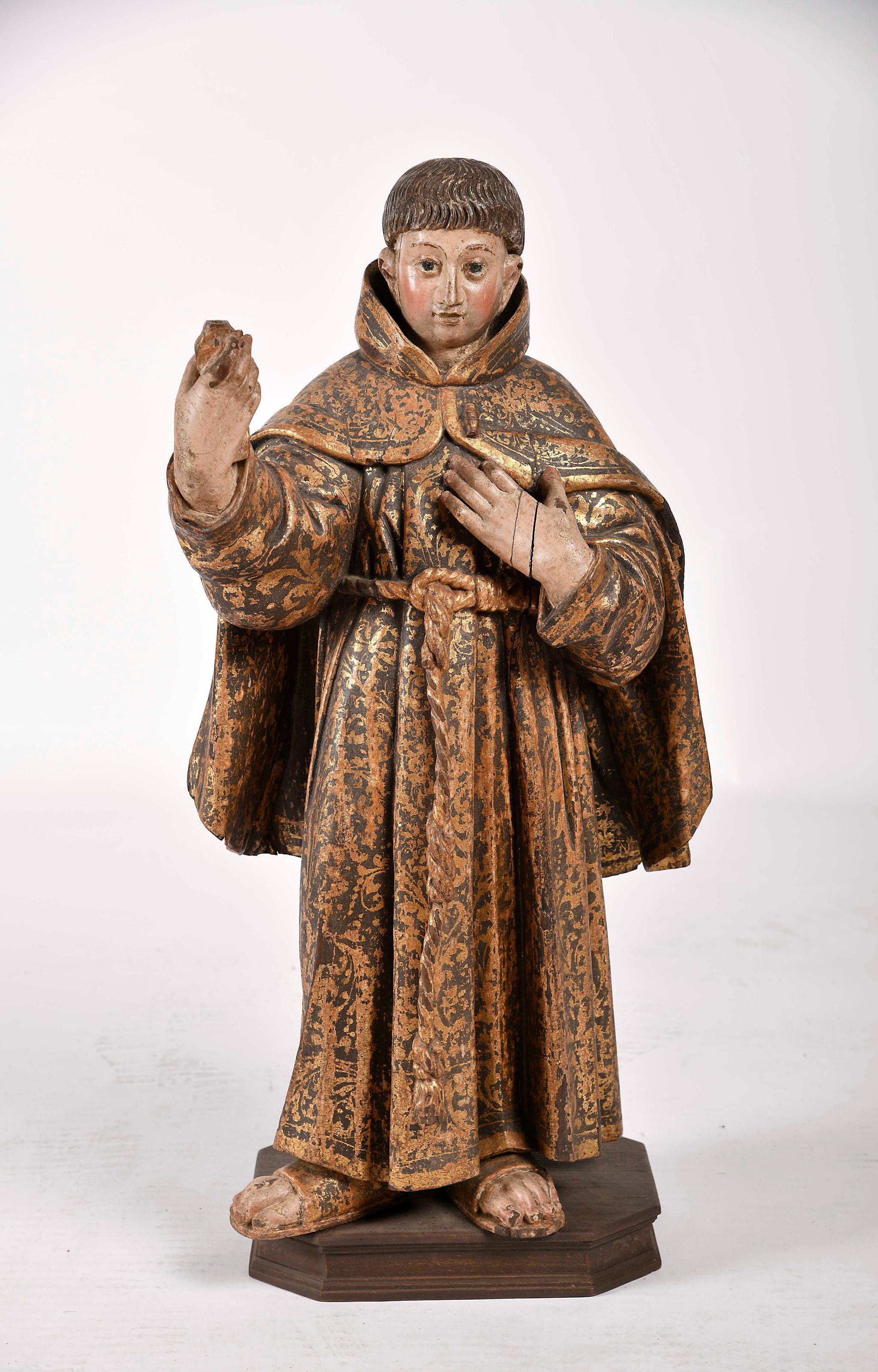 Santo franciscano escultura em madeira dourada e policromada Portuguesa séc. XVII/XVIII colagens nos dedos, fissuras, pequenas faltas e defeitos, base posterior Dimensões (altura x comprimento x largura) - (escultura) 62,5 cm