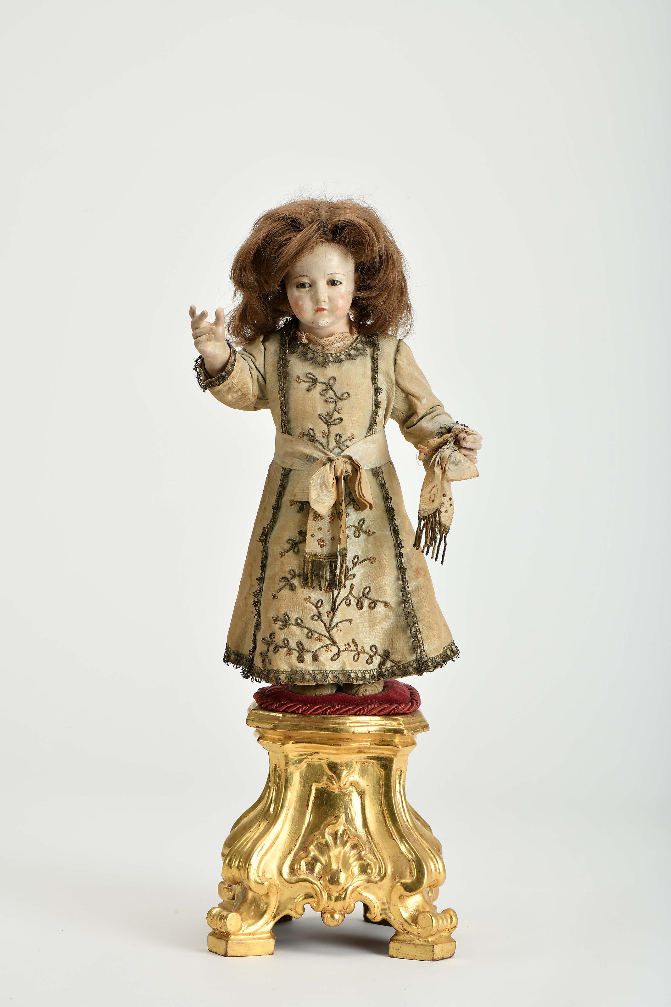 Menino Jesus de Vara Crucífera escultura em madeira policromada olhos de vidro, cabelo natural, vestes em tecido bordado a fio metálico dourado, peanha em madeira entalhada e dourada Portuguesa séc. XVIII falta da vara crucífera, um dedo partido e colado, faltas na camada pictórica Dimensões (altura x comprimento x largura) - (escultura) 40,5 cm; (total) 65 cm