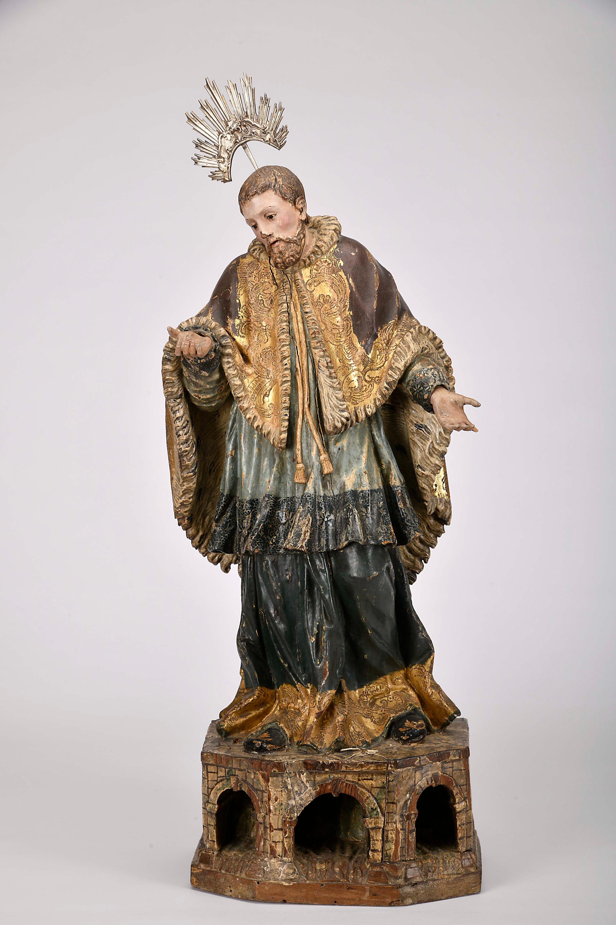São João Nepomuceno escultura em madeira dourada e policromada resplendor em prata relevada Portuguesa falta de um dedo, faltas na policromia, fissuras e outras pequenas faltas, falta do crucifixo prata sem marcas, ao abrigo do Decreto-Lei nº 120/2017, de 15 de Setembro - art. 2º, nº 2, alínea c) Dimensões (altura x comprimento x largura) - (escultura e base) 77 cm