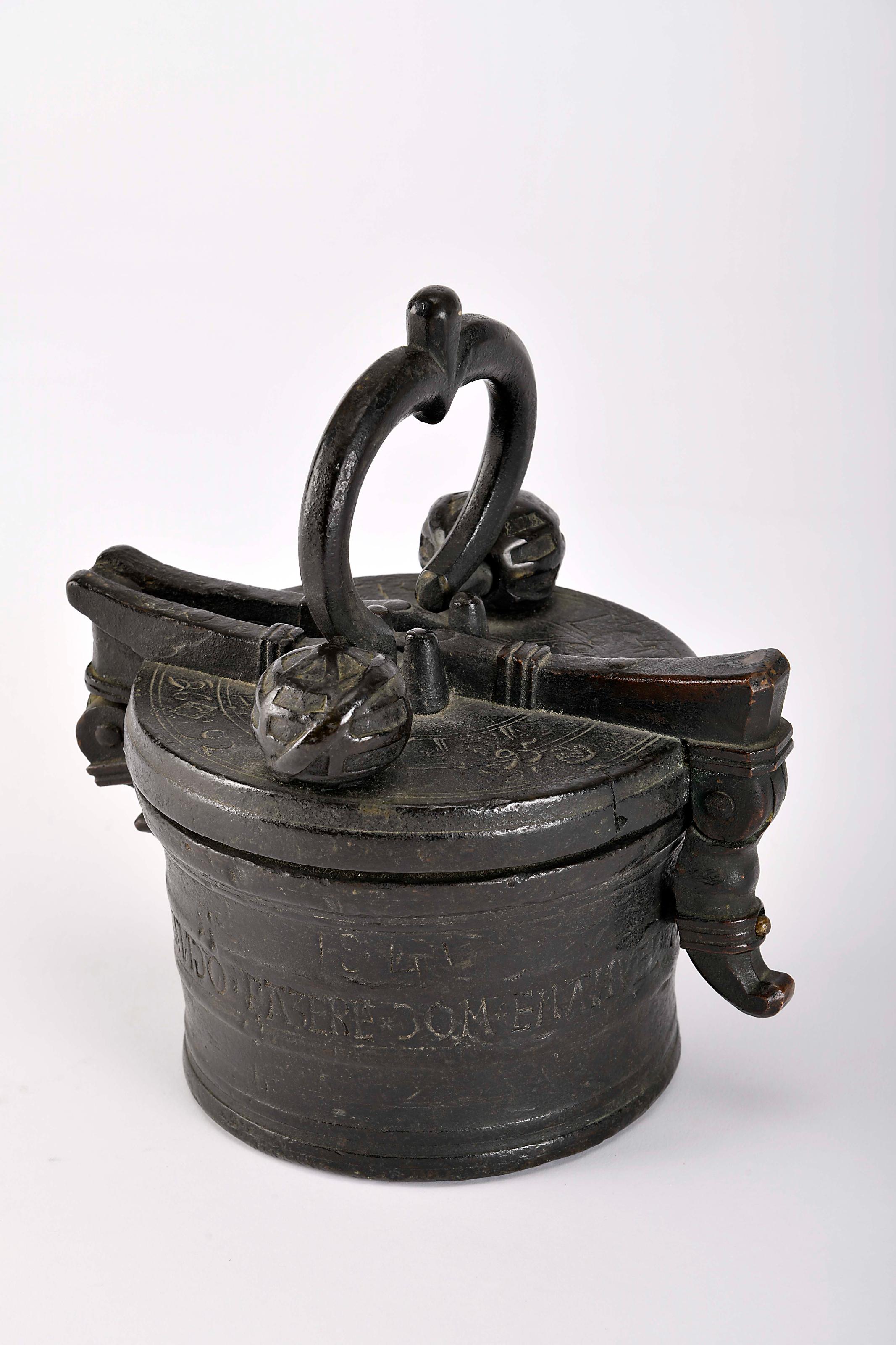 Caixa de pesos manuelina ferro decoração relevada "Esferas armilares", inscrição gravada *ME* MANDO* FAZERE* DOM* EMANVEL* REI* PORTVGAL* ANO* D* 1499*, diversas punções e inscrições de aferição da caixa e dos seus pesos Alemã - Nuremberga falta das duas chapas com as armas do Reino de Portugal, outras pequenas faltas e defeitos, pesos menores substituídos Dimensões (altura x comprimento x largura) - 21 x 21 x 16 cm Notas: vd. catálogo da exposição "Vi o Reino Renovar - Arte no tempo de D. Manuel I". Lisboa: Museu Nacional de Arte Antiga, 2021, p. 266, nºs 109 e 110.