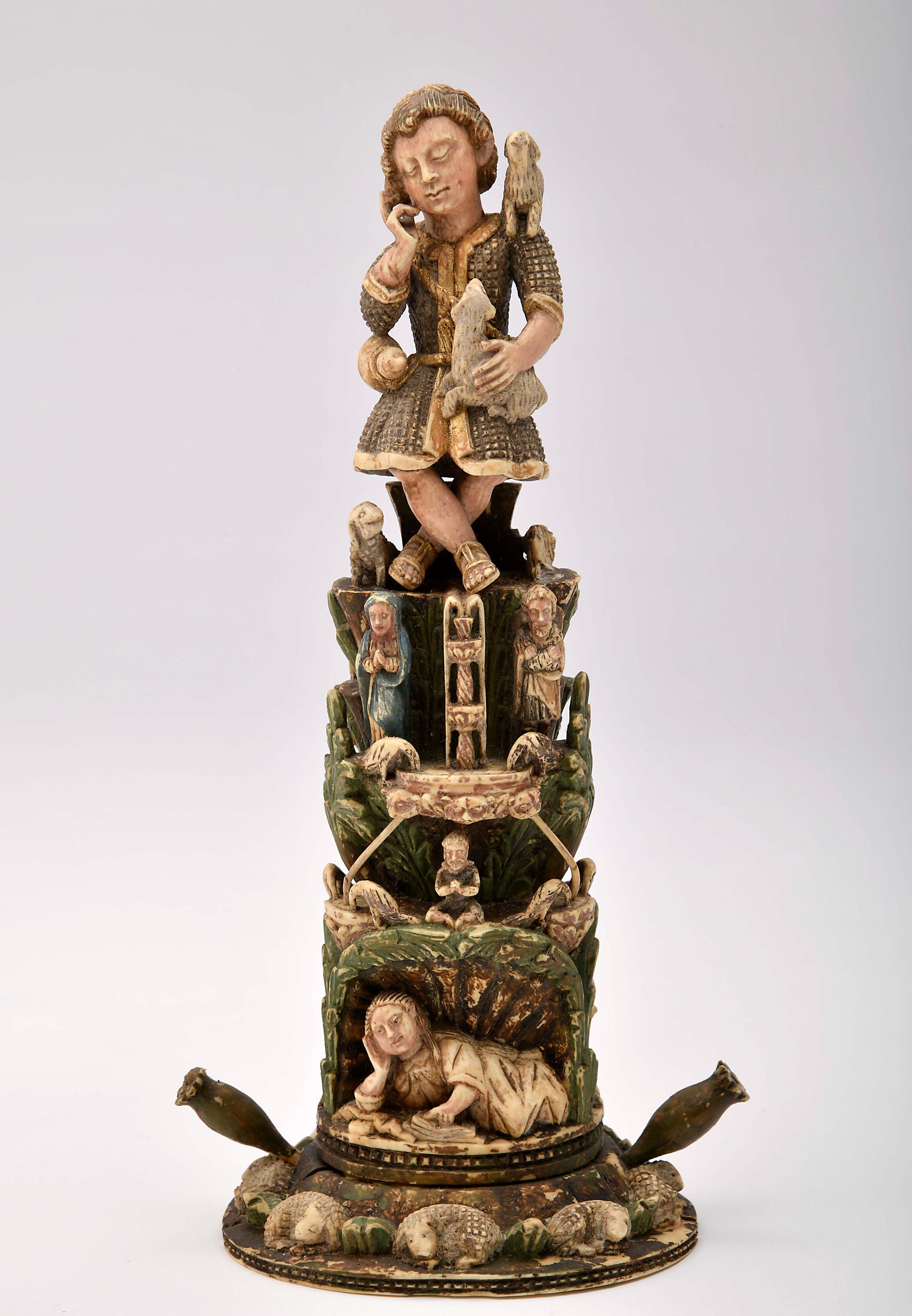 Menino Jesus Bom Pastor Lusíada escultura em marfim pintado e dourado base em socalcos "Nossa Senhora e São José, Santa Maria Madalena, Eremita, Fonte da Vida e animais diversos" vertente Indo-Portuguesa séc. XVII/XVIII restauros na pintura e no dourado, pequenas colagens, fissura na base Dimensões (altura x comprimento x largura) - 24,5 cm; Peso - (marfim) 522 g. Notas: vd. exemplares semelhantes no catálogo da exposição "A Expansão Portuguesa e a Arte do Marfim". Lisboa: Fundação Calouste Gulbenkian, 1991, pp. 98-99 e 109, nºs 243, 245 e 273.a) Este lote está sujeito às restrições CITES de exportação/importação e encontra-se devidamente certificado: nº 25PTLX04484C;b) É actualmente proibida por diversos países a importação de bens que incorporem materiais de espécies da fauna e flora selvagens protegidas, incluindo, entre outros, marfim, coral e tartaruga;c) Em Portugal, em conformidade com a prevista transposição para a legislação nacional das mais recentes orientações da UE relativas ao comércio de marfim, está suspensa a emissão de certificados de reexportação para países que não integrem a UE;d) Neste contexto, aconselham-se os seus potenciais compradores a informarem-se previamente sobre a legislação do seu país e restrições internacionais aplicáveis.