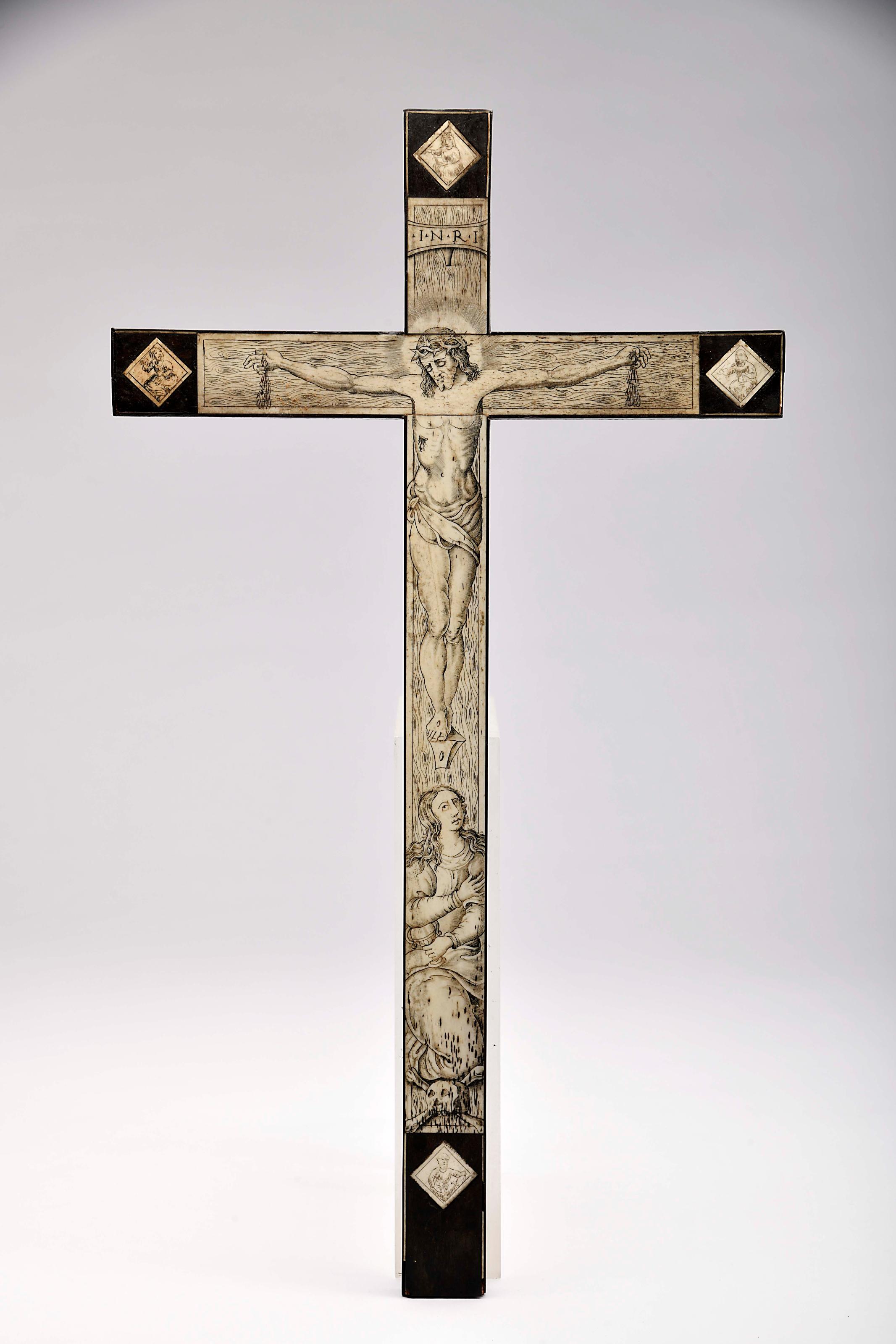 Crucifixo estrutura em pau-santo revestido a placas de marfim gravado com fundos preenchidos a negro "Cristo crucificado, Santa Maria Madalena, «Titulus Crucis» e quatro Evangelistas" Europeu séc. XVII falta de alguns filetes de marfim, outras pequenas faltas e defeitos Dimensões (altura x comprimento x largura) - (cruz) 42,5 cm; Peso - 168 g. Notas: a) Este lote está sujeito às restrições CITES de exportação/importação e encontra-se devidamente certificado: nº 25PTLX04455C;b) É actualmente proibida por diversos países a importação de bens que incorporem materiais de espécies da fauna e flora selvagens protegidas, incluindo, entre outros, marfim, coral e tartaruga;c) Em Portugal, em conformidade com a prevista transposição para a legislação nacional das mais recentes orientações da UE relativas ao comércio de marfim, está suspensa a emissão de certificados de reexportação para países que não integrem a UE;d) Neste contexto, aconselham-se os seus potenciais compradores a informarem-se previamente sobre a legislação do seu país e restrições internacionais aplicáveis.