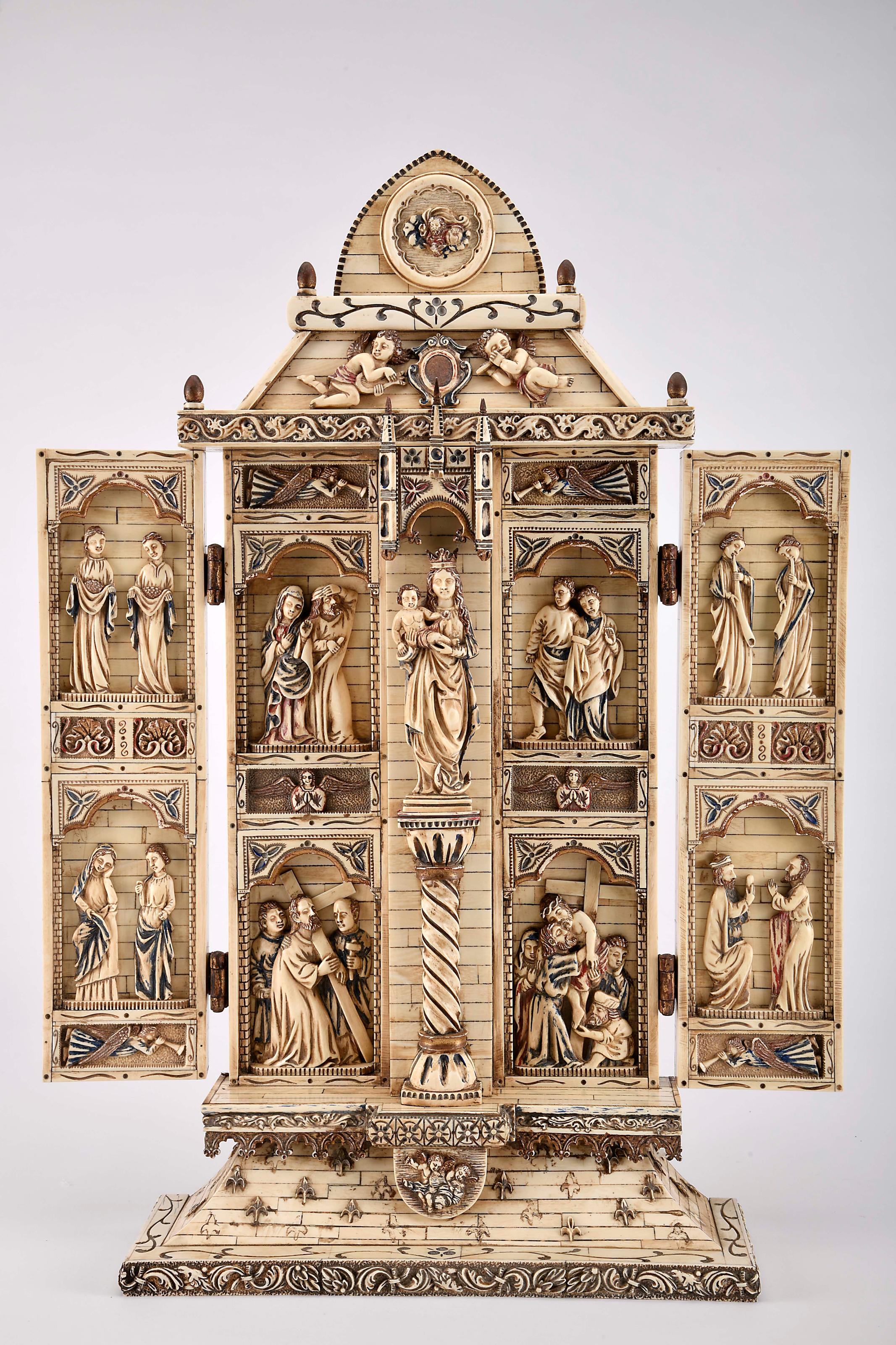Triptico estilo neo-gótico estrutura de madeira revestida por placas de marfim exterior com escultura "Nossa Senhora com o Menino Jesus e anjos músicos sob Deus-Pai", base com decoração relevada "Flores de Lis", interior relevado "Oito cenas do cristianismo", ferragens em ferro dourado Francês séc. XIX/XX Dimensões (altura x comprimento x largura) - 58,5 cm Notas: a) Este lote está sujeito às restrições CITES de exportação/importação e encontra-se devidamente certificado: nº 25PTLX04487C;b) É actualmente proibida por diversos países a importação de bens que incorporem materiais de espécies da fauna e flora selvagens protegidas, incluindo, entre outros, marfim, coral e tartaruga;c) Em Portugal, em conformidade com a prevista transposição para a legislação nacional das mais recentes orientações da UE relativas ao comércio de marfim, está suspensa a emissão de certificados de reexportação para países que não integrem a UE;d) Neste contexto, aconselham-se os seus potenciais compradores a informarem-se previamente sobre a legislação do seu país e restrições internacionais aplicáveis.