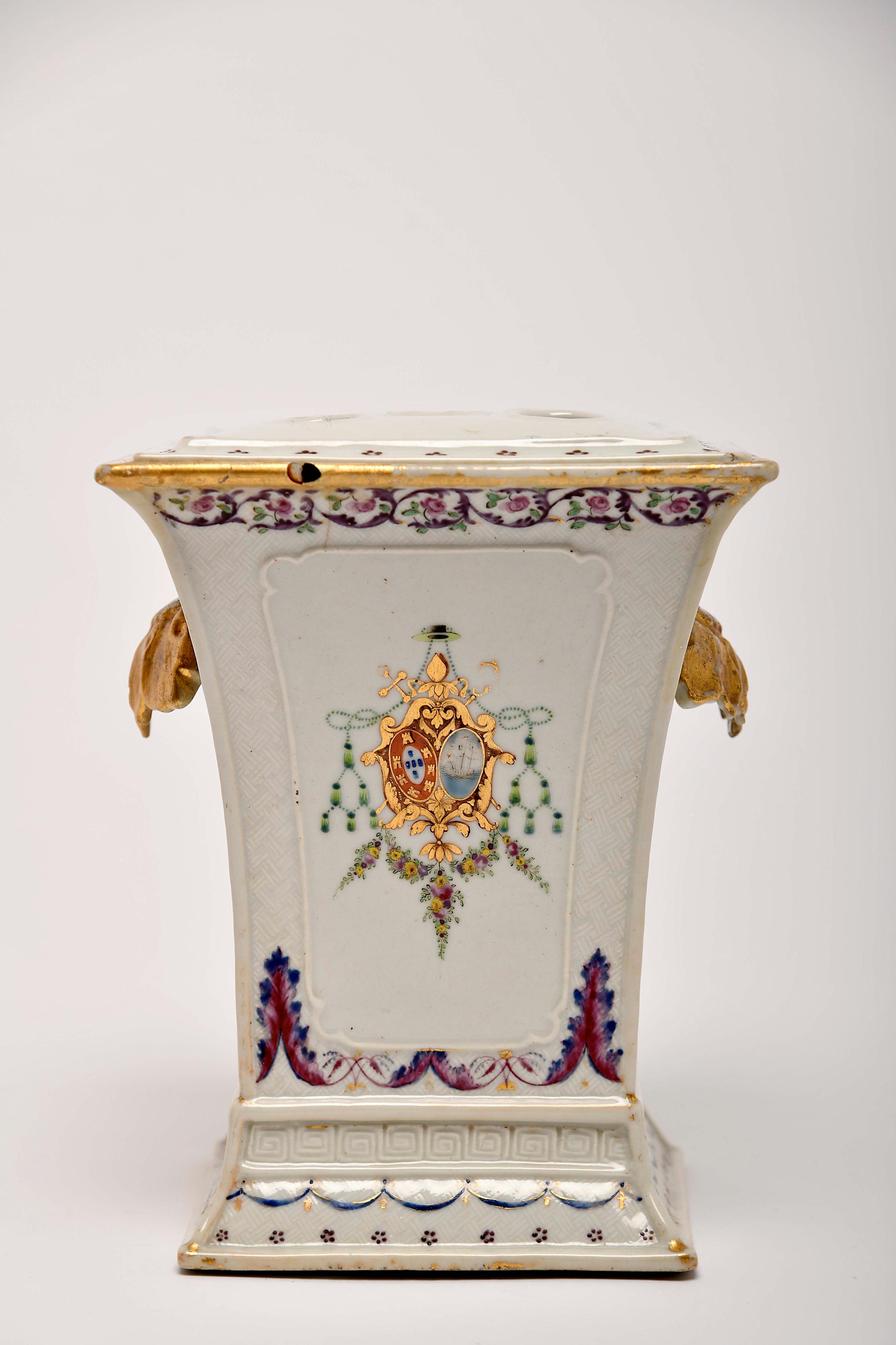 Floreira com grelha porcelana Chinesa de exportação decoração policromada e dourada com armas tradicionalmente atribuídas ao Real Mosteiro de São Vicente de Fora (Lisboa) da Ordem de Santo Agostinho reinado Qianlong (1736-1795) restauros, falta e cabelo no bordo, desgaste no dourado Dimensões (altura x comprimento x largura) - 22 x 17,5 x 18 cm Notas: integrou a Colecção Jorge Getúlio Veiga - Rio de Janeiro, nº 159, conforme etiqueta colada na base, encontrando-se reproduzida em VEIGA, Jorge Getúlio - "Chinese Export Porcelain in Private Brasilian Collections". London: Han-Shan Tang, 1989, p. 189.Vd. CASTRO, Nuno de - "A Porcelana Chinesa ao Tempo do Império, Portugal/Brasil". Lisboa: ACD Editores, 2007, p. 357; e SANTOS, A. Varela - "Portugal na Porcelana da China - 500 Anos de Comércio". Lisboa: Artemágica, 2008, volume II, pp. 590 a 593, nº 4.07, onde é colocada em causa a referida atribuição.