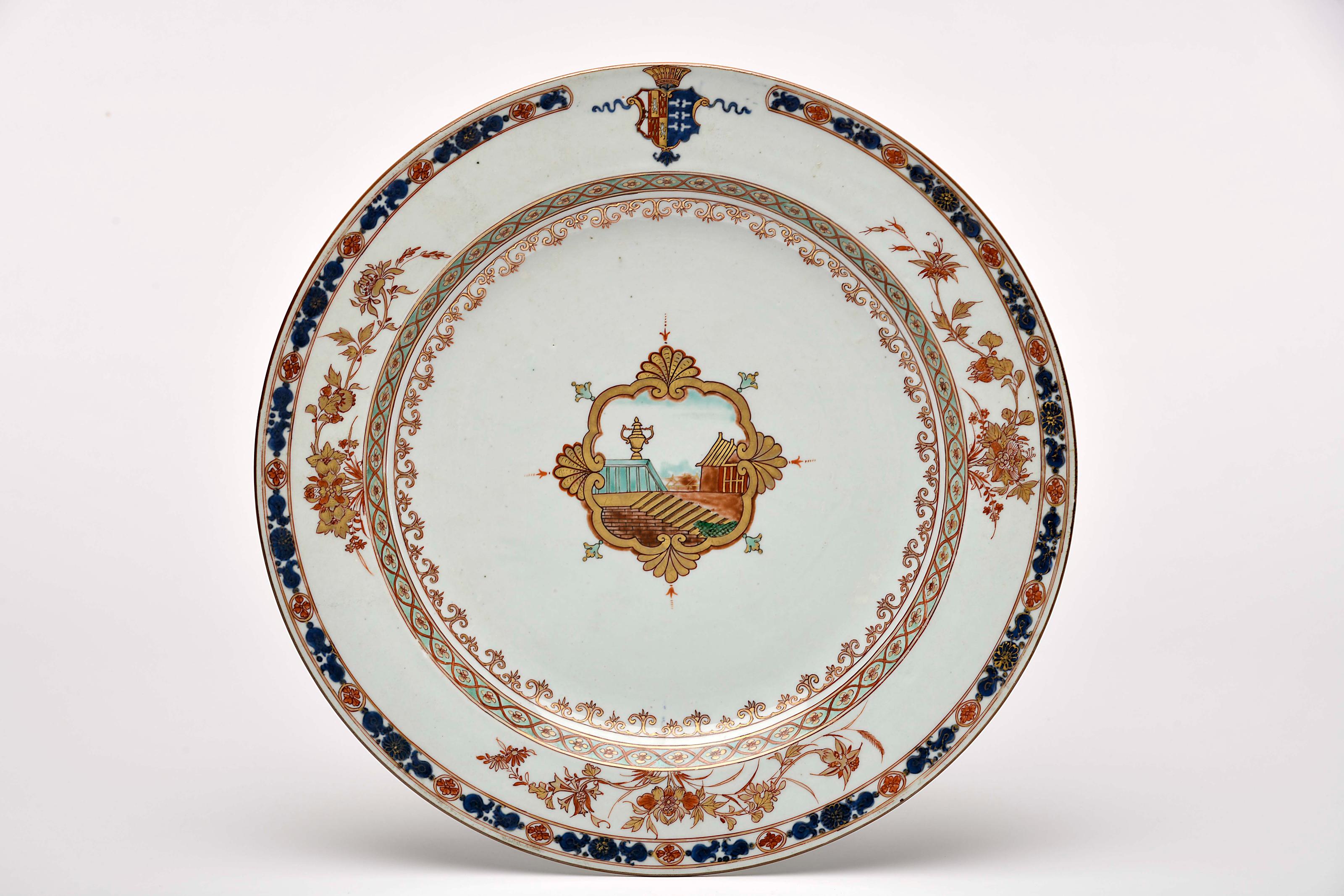 Prato grande porcelana Chinesa de exportação decoração a sépia, azul e dourado com reserva policromada "Paisagem europeia", aba com armas atribuídas a Luís Correia da Costa Cerveira - 2º serviço reinado Yongzheng (1722-1735) ligeiro desgaste na decoração Dimensões (altura x comprimento x largura) - 42 cm Notas: vd. CASTRO, Nuno de - "A Porcelana Chinesa ao Tempo do Império, Portugal/Brasil". Lisboa: ACD Editores, 2007, p. 126; e SANTOS, A. Varela - "Portugal na Porcelana da China: 500 Anos de Comércio". Lisboa: Artemágica, 2009, volume III, pp. 844-845, nº 6.08.