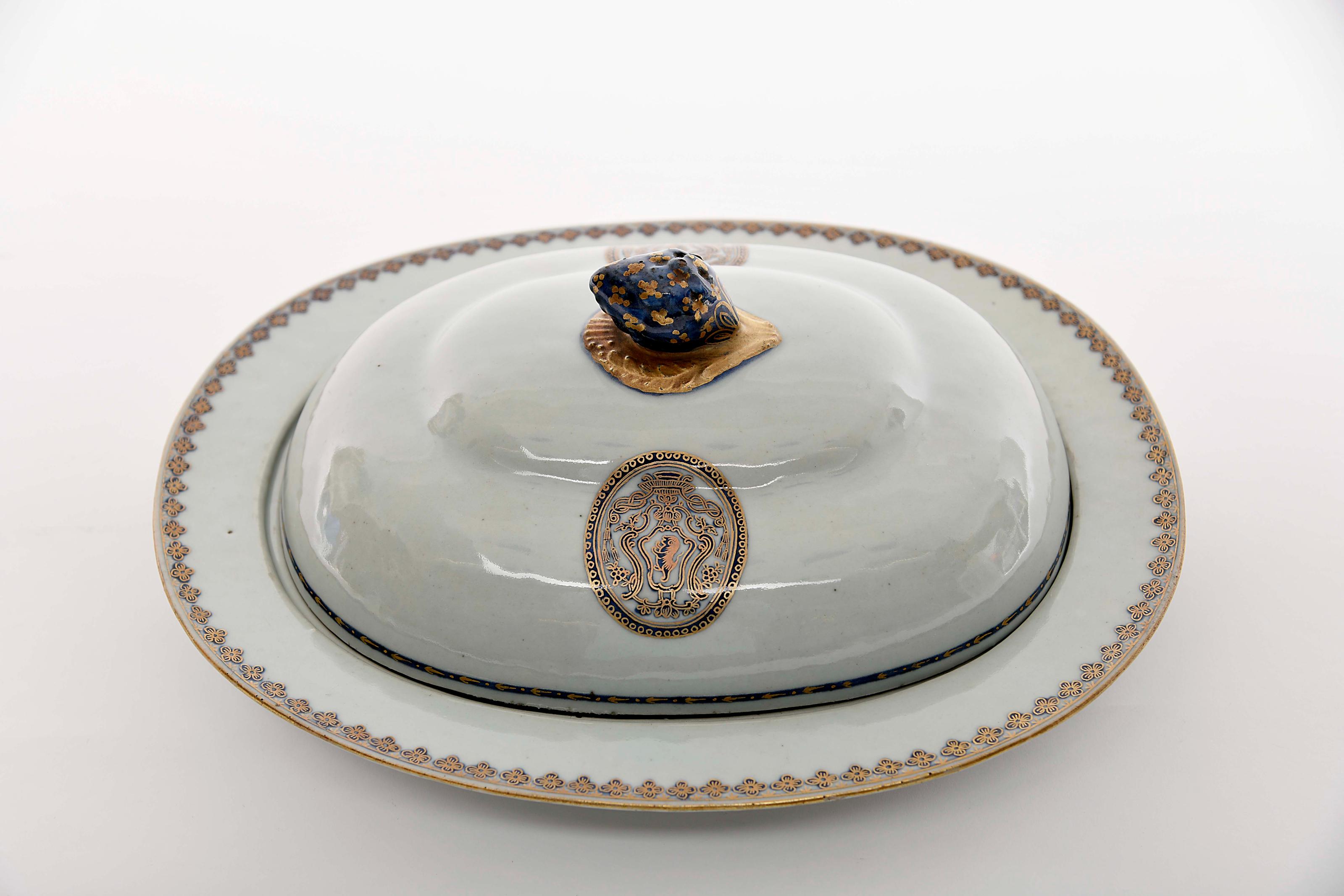 Prato coberto oval porcelana Chinesa de exportação decoração a azul e dourado com armas tradicionalmente atribuídas a D. Luís de Castelo Branco Correia e Cunha (1683-1749), 4º Conde de Pombeiro reinado Qianlong (1736-1795) ligeiro desgaste no dourado Dimensões (altura x comprimento x largura) - 13 x 33,5 x 28 cm Notas: vd. CASTRO, Nuno - "A Porcelana Chinesa ao Tempo do Império - Portugal / Brasil". Lisboa: ACD Editores, 2007, p. 132; e SANTOS, A. Varela - "Portugal na Porcelana da China - 500 Anos de Comércio". Lisboa: Artemágica, 2008, volume II, pp. 647-650; e DIAS, Pedro - "Heráldica Portuguesa na Porcelana da China Qing". Lisboa: Fundação Macau, 2014, pp. 226-227.