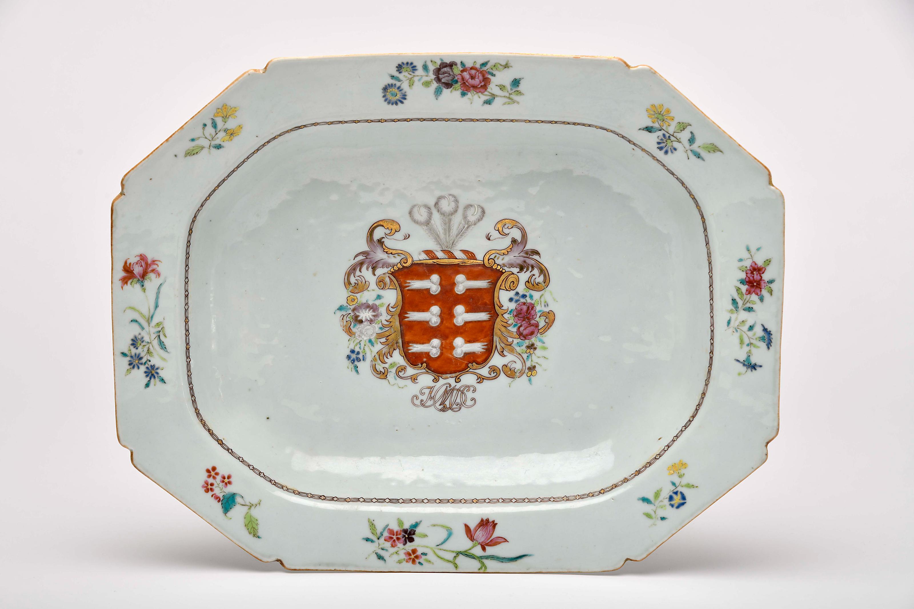 Travessa oitavada de terrina porcelana Chinesa de exportação decoração policromada e dourada "Flores" com armas atribuídas a Catarina Mendes da Costa (1678-1756) e monograma JCMDC reinado Qianlong (1736-1795) pequeno restauro na policromia, ligeiro desgaste na decoração Dimensões (altura x comprimento x largura) - 6,7 x 37,6 x 30 cm Notas: importante família judaica de origem portuguesa estabelecida em Inglaterra. Vd. CASTRO, Nuno de - "A Porcelana Chinesa ao Tempo do Império - Portugal/Brasil". Lisboa: ACD Editores, 2007, p. 138; SANTOS, A. Varela - "Portugal na Porcelana da China: 500 Anos de Comércio" - vol. III. Lisboa: Artemágica, 2009, pp. 968-969; BACHMANN, Robert - "Serviços de porcelana chinesa encomendados por judeus portugueses na diáspora". In SANTOS, A. Varela - "Portugal na Porcelana da China: 500 Anos de Comércio" - vol. IV. Lisboa: Artemágica, 2010, pp. 1053-1073 - pp. 1062-1064, fig. 13; e "Um Olhar do Porto - Uma Colecção de Artes Decorativas", catálogo da exposição realizada na Quinta das Cruzes. Funchal: Museu Quinta das Cruzes, 2005, pp. 148-149, nº 51.