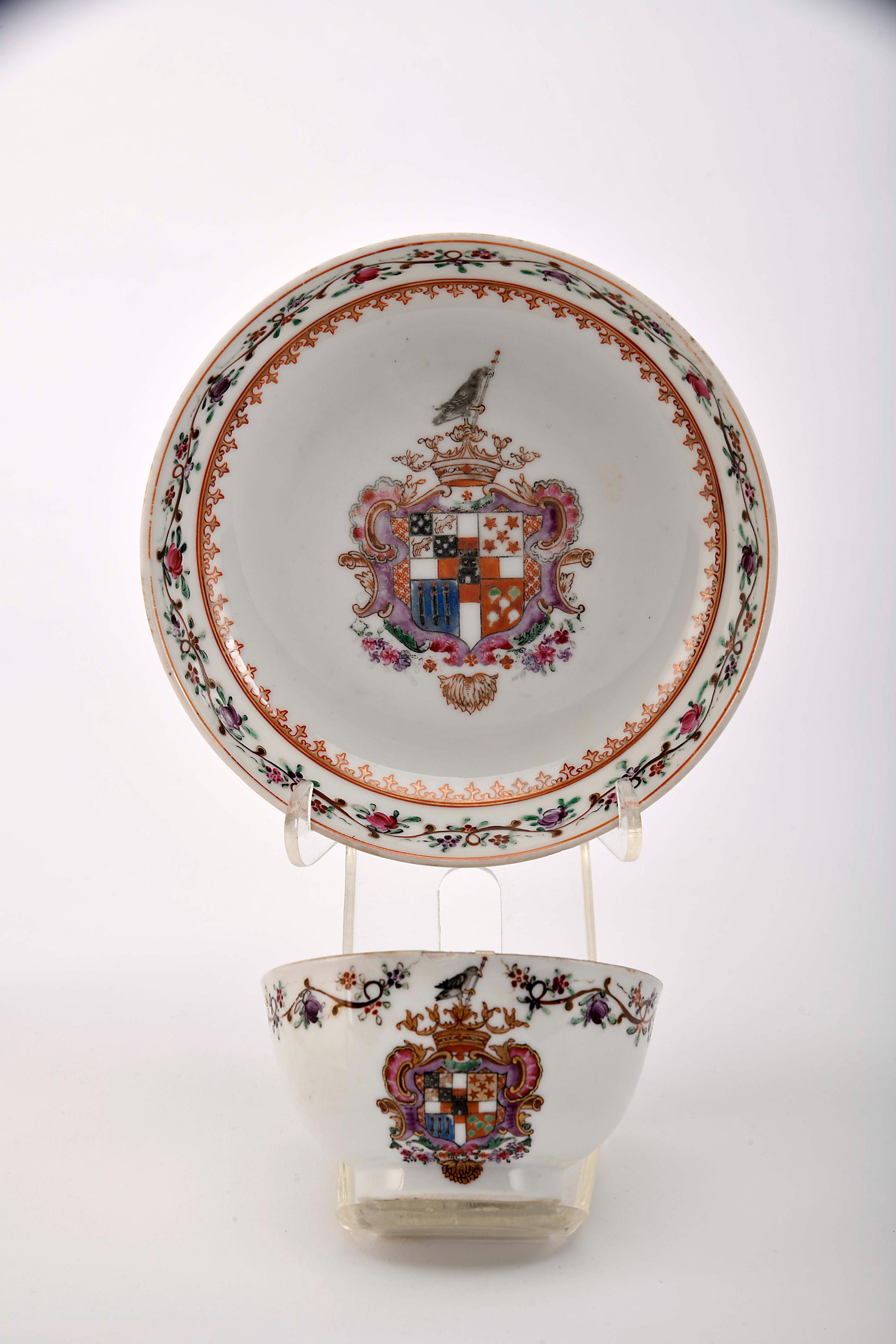 Taça com pires porcelana Chinesa de exportação decoração policromada e dourada com armas de António de Sousa Falcão de Saldanha Coutinho (17??-1761) reinado Qianlong (1736-1795) taça com pequenas esbeiçadelas e faltas no vidrado do bordo, pires com cabelo, degaste no dourado Dimensões (altura x comprimento x largura) - (taça) 4,7 x 8,8 cm; (pires) 13,8 cm Notas: vd. CASTRO, Nuno de - "A Porcelana Chinesa ao Tempo do Império, Portugal/Brasil". Lisboa: ACD Editores, 2007, p. 148; SANTOS, A. Varela - "Portugal na Porcelana da China: 500 Anos de Comércio". Lisboa: Artemágica, 2009, volume III, nº 6.18, pp. 900-904; e DIAS, Pedro - "Heráldica Portuguesa na Porcelana da China Qing". Lisboa: Fundação Macau, 2014, pp. 142-143.