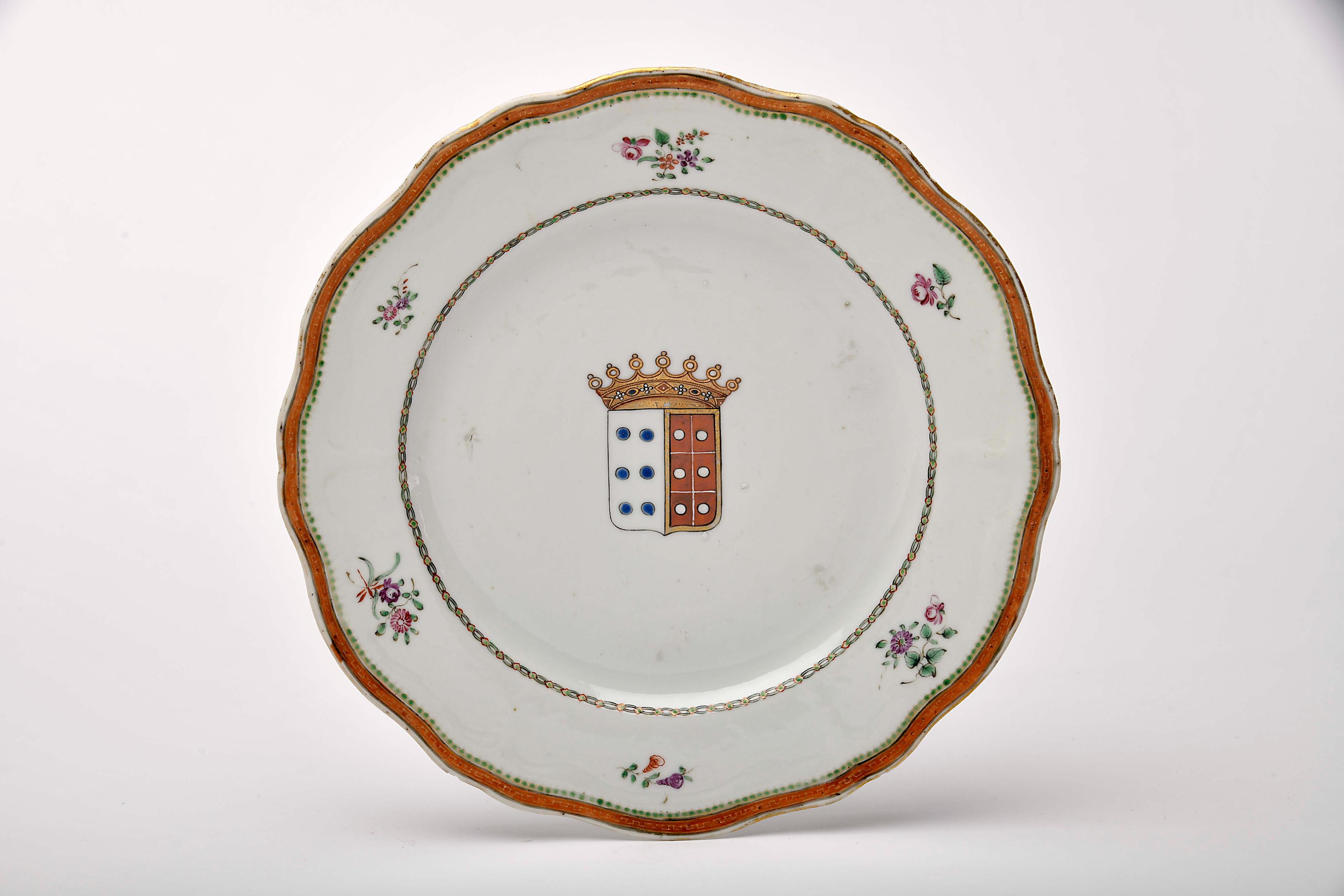 Prato recortado porcelana Chinesa de exportação decoração policromada e dourada com armas de Manuel Bernardo de Melo e Castro (1716-1792), 1º visconde da Lourinhã reinado Qianlong (1736-1795) pequenas esbeiçadelas, algum desgaste no dourado Dimensões (altura x comprimento x largura) - 24 cm Notas: vd. CASTRO, Nuno de - "A Porcelana Chinesa ao Tempo do Império - Portugal/Brasil". Lisboa: ACD Editores, 2007, p. 155; SANTOS, A. Varela - "Portugal na Porcelana da China - 500 Anos de Comércio" - vol. III. Lisboa: Artemágica, 2009, pp. 1189-1191; e DIAS, Pedro - "Heráldica Portuguesa na Porcelana da China Qing". Lisboa: Fundação Macau, 2014, pp. 182-183.